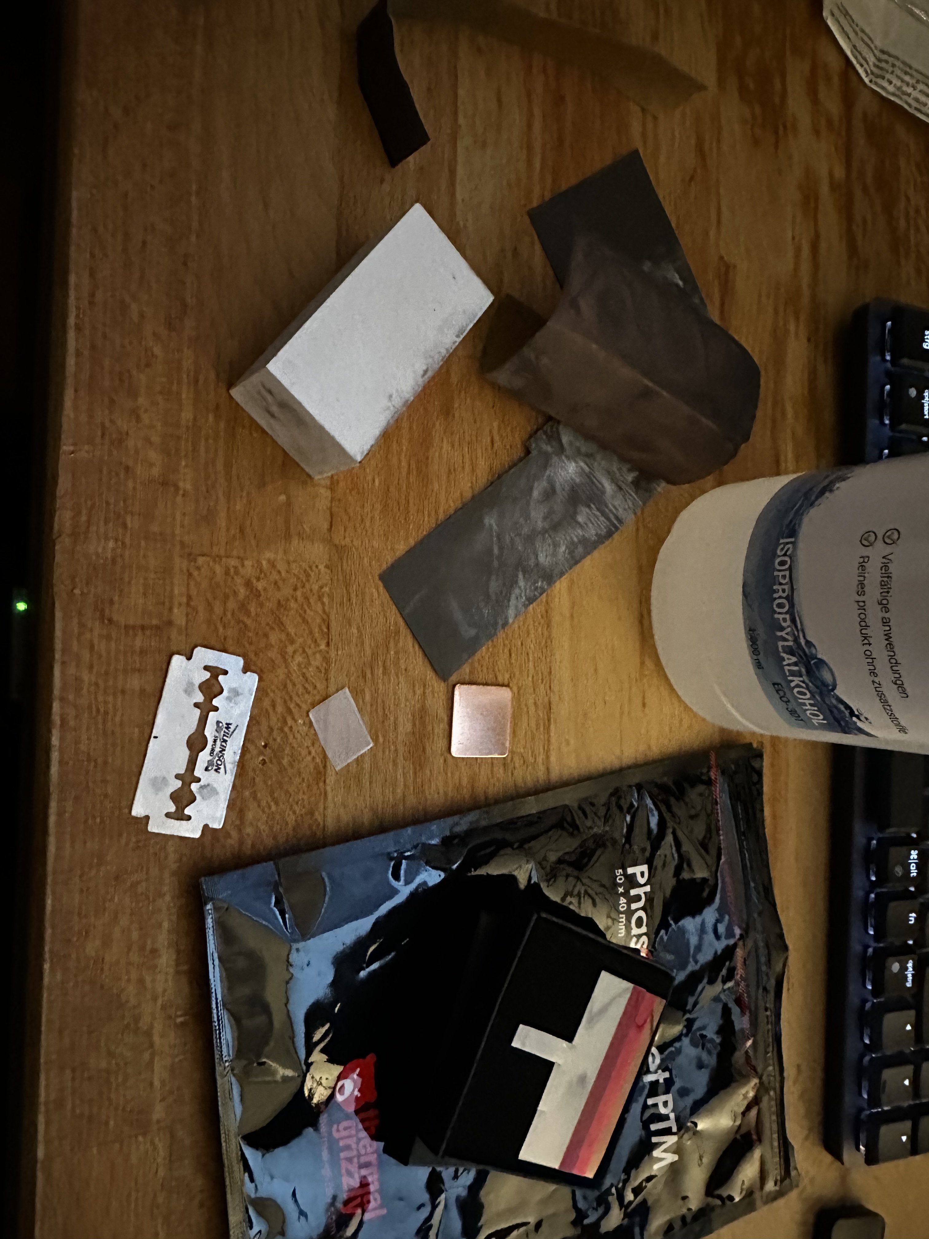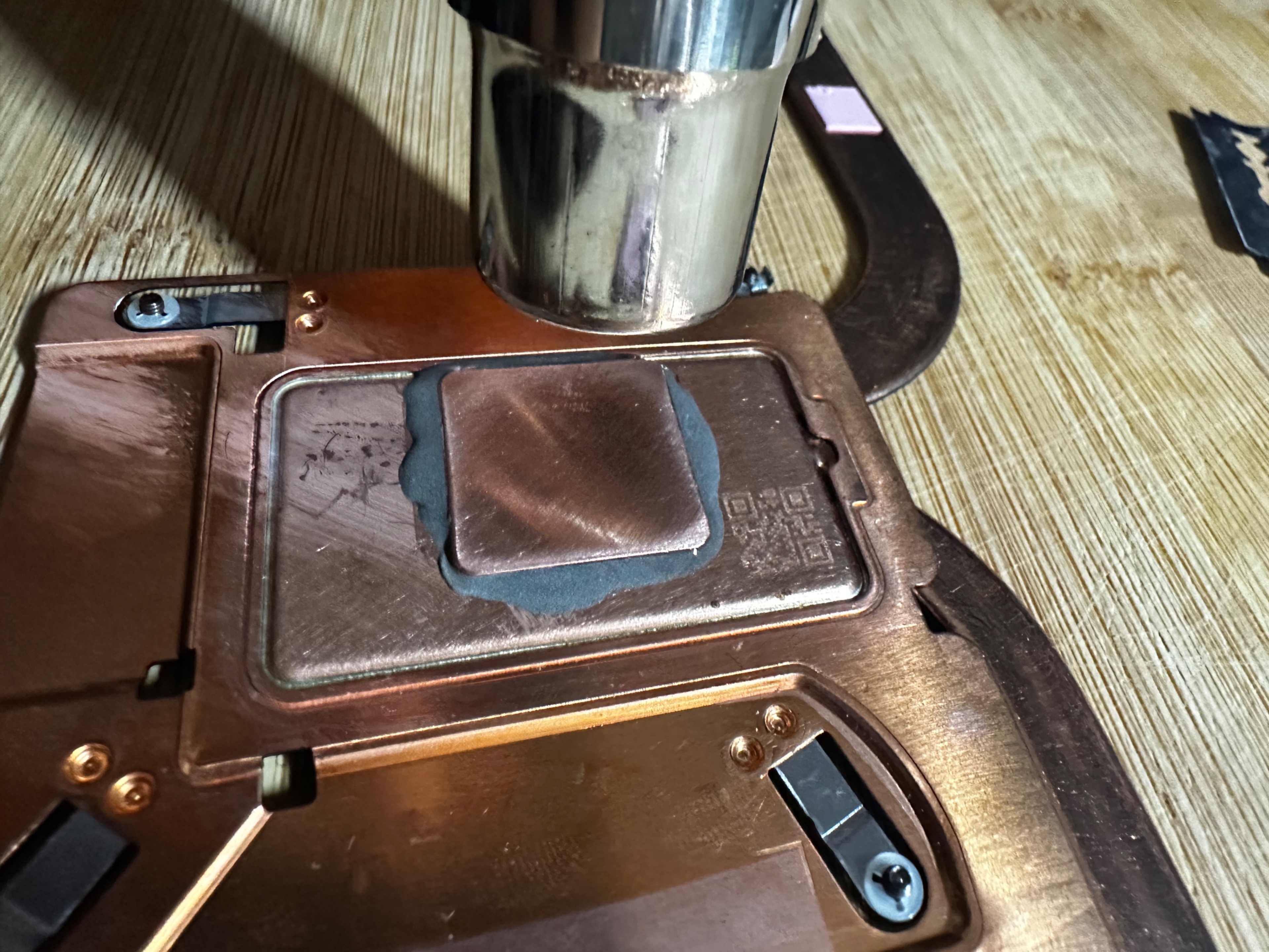 Der Originale Kupferheatspreader, ist auf die Vaporchamber geklebt. Die Klebefläche selbst ist aber kleiner als der CPU DIE. also Originalen Heatspreader abgekratzt und ein 0,8x20x20mm Kupferstück auf die Vaporchamber gelötet. Alternativ geht auch das Kupferstück oben und unten mit ptm bekleben und das hält durch den Anpressdruck und das aushärten des PTM.