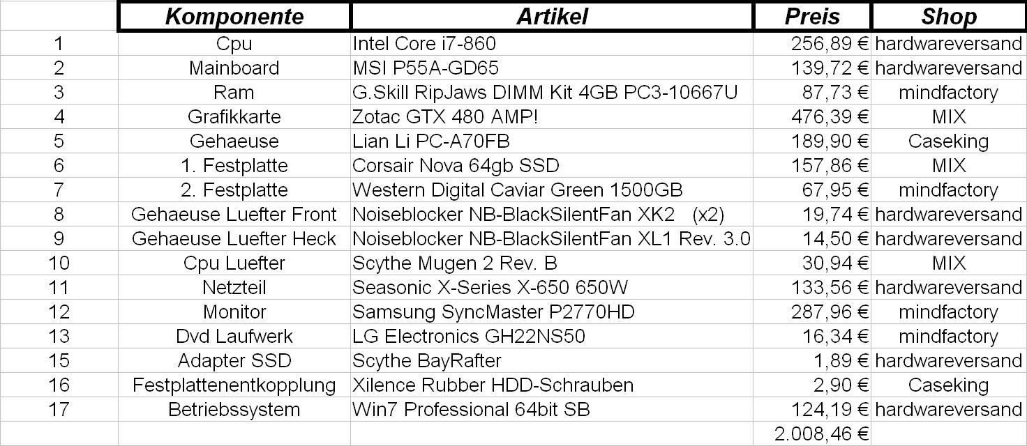 Wie im Threadtitel bereits erwaehnt, soll das alles zusammen ca. 2000€ kosten. Tastatur und Maus sowie Headset sind bereits vorhanden, deshalb tauchen die in der Konfiguration nicht mehr auf.