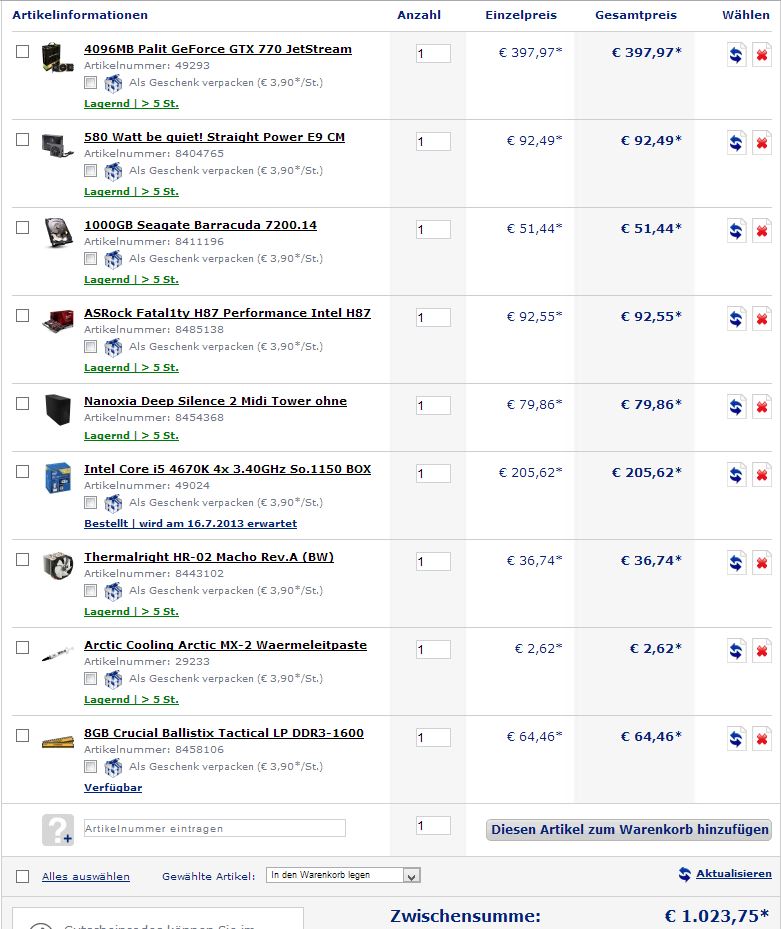 Ich wollte mir jetzt im August einen neuen Gaming Rechner zusammenbauen für ca. 1000€.