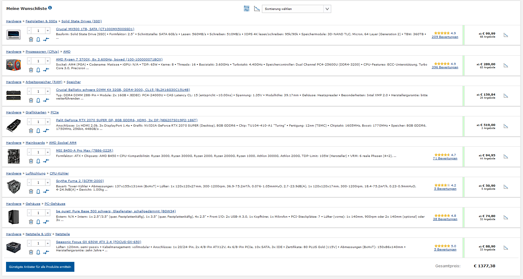 Hallo ich möchte mir einen Gaming/ Streaming PC bauen und habe mir schon eine Liste bei Geizhals zusammengestellt, es wäre nett wenn ihr drüber schauen könntet und vielleicht verbesserungsvorschläge habt.