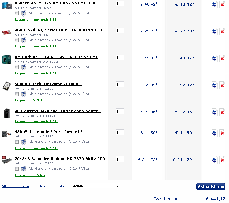 würde bei Mindfactory auf 500,41€ kommen. Die 41 ct werd ich ihm dann schenken, da ich das Budget von 500€ nicht überschreiten darf.