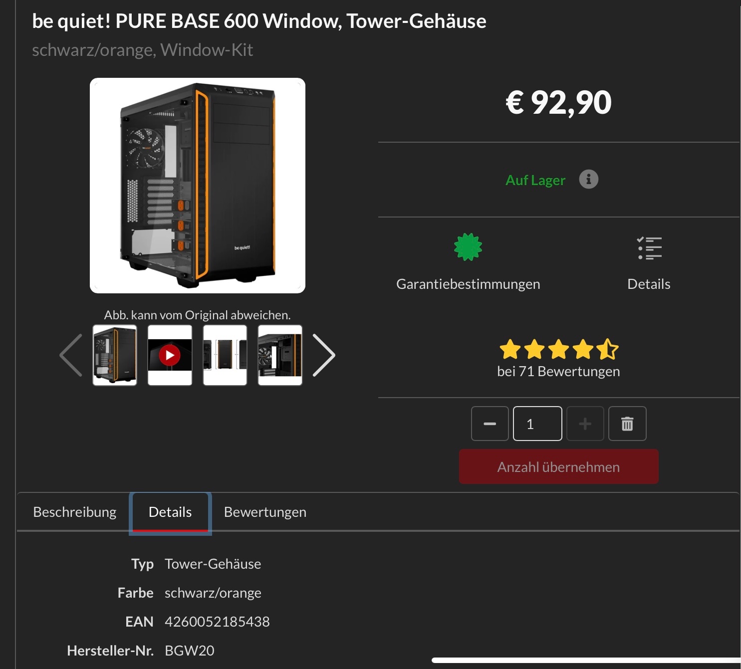 Gehäuse: Das be quiet! Pure Base 600 sah ganz schick aus. Ich weiß aber nicht, ob der CPU Kühler da rein passt? Ansonsten bin ich da ganz offen.
