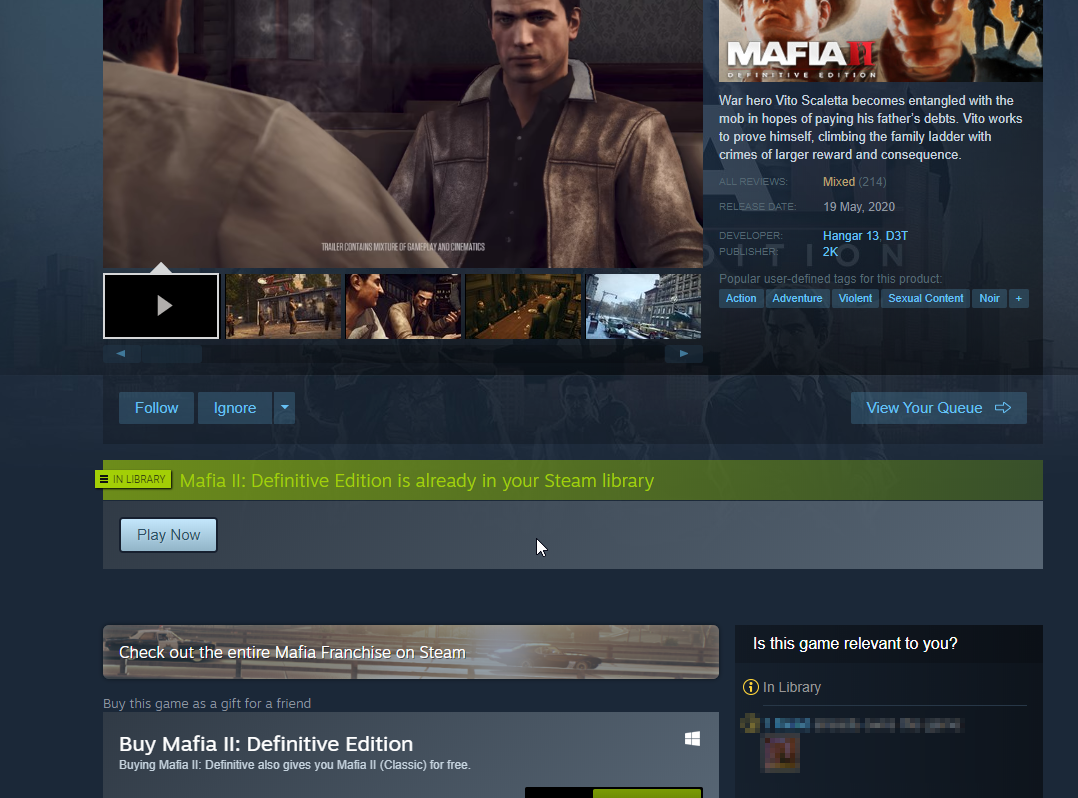 Also ich hab Mafia 2 Classic in der Liste aber die Definitive Edition hab ich nicht. Und auf der Store Page kann ich die nur kaufen, auch nach einem Steam Neustart. ...