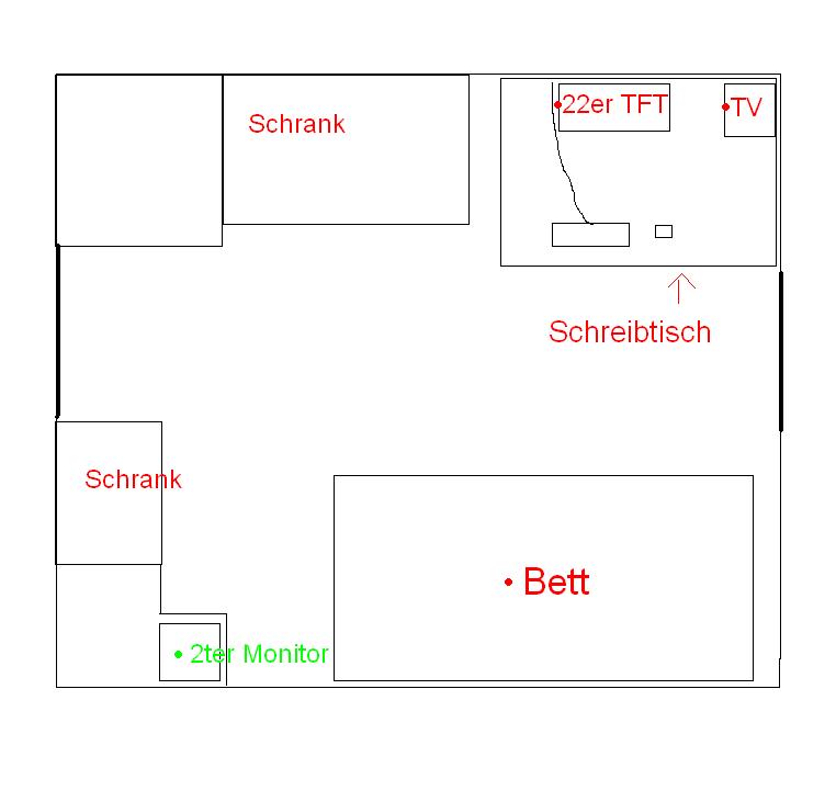 Hallo liebe CB'ler, ich hätte jetzt mal ne ganz 'bescheuerte'' und verrückte Frage an Euch. Da ich nicht weiterweiß stell ich sie nun hier im Forum. Ich weiß zwar nicht ob es hier reinpasst....nun ja. Ich würde gerne meinen Fernseher und meinen Monitor an den 2. Monitor anschlißen und mit einem Schalter auf ihn zwischen den PC-Monitor und dem Fernseher umschalten, damit ich auch im Bett schauen kann. Ich schau nämlich sehr gerne Filme auf dem PC und habe leider keinen DVD-Player. Wohne im Moment noch bei meinen Eltern und möchte nicht ständig ins Esszimmer runterlatschen um dort zu guggen. Habe noch ein Bildchen mit Paint hochgeladen. Ginge das. Wenn ja...welche Kabel bräuchte man da und wieviele?