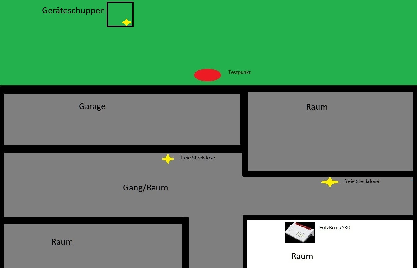 Leider müssen doch einige Räume/Gänge überwunden werden bis zum Garten. Ich war doch etwas überrascht das ich an dem rot eingezeichneten Testpunkt noch eine funktionierende Wlan Verbindung per Smartphone mit der FritzBox herstellen konnte.