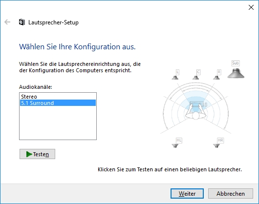 Klicke ich in Sound mit rechts auf meinen Lautsprecher und dann im Kontextmenü auf "Testen", dann spielt er alle 5.1 Lautsprecher hörbar an.