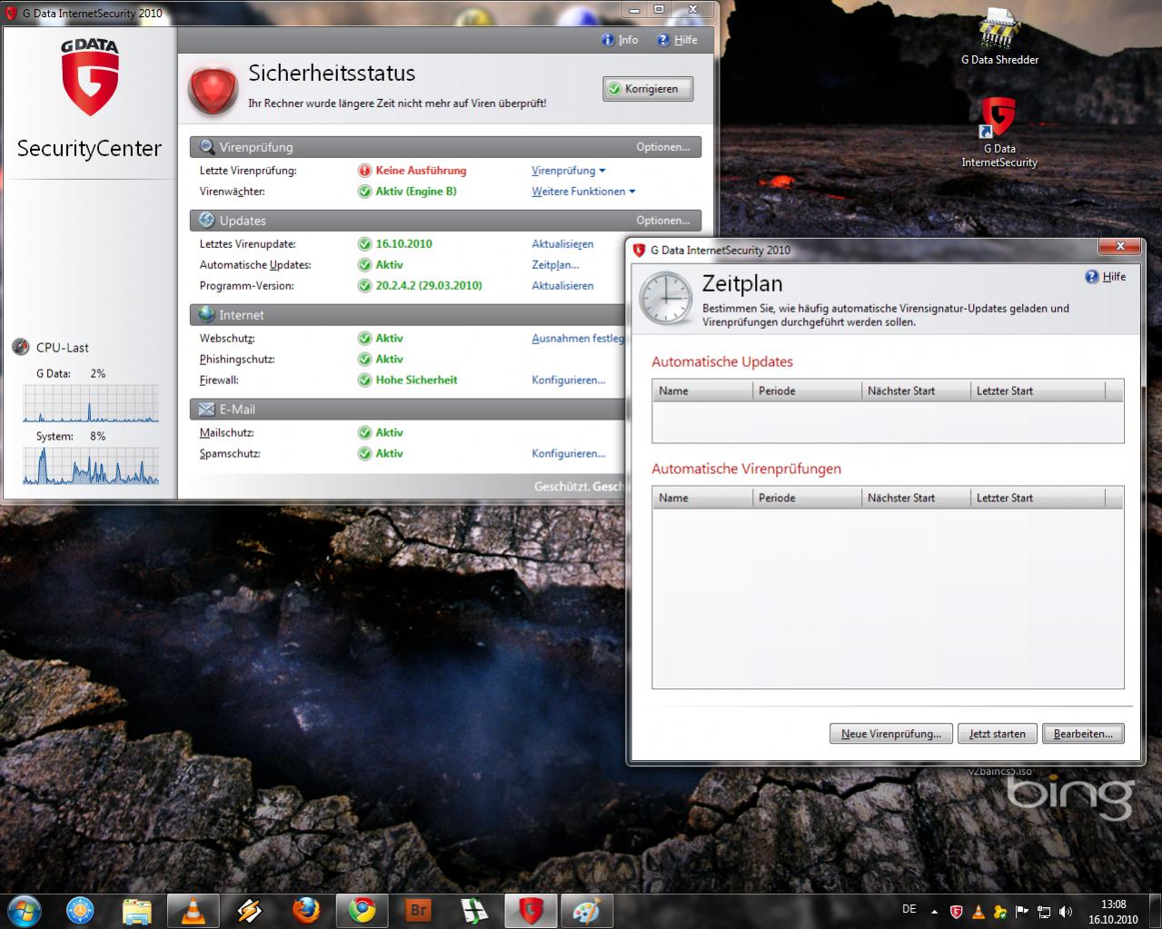 bei mir ist die GData Version von PCWelt installiert. Seitdem ich mal fast einen Virus eingefangen hatte funktioniert die automatische Updatefunktion nicht mehr. Seither muss ich immer im Systemtray RTM (rechte Maustaste) und Viren-Update anklicken. Dort funktioniert aber alles normal. Zwischendurch habe ich mir von einem Freund einen Virus geholt. (absichtlich) Direkt danach habe ich GData alles überprüfen gelassen und er hat den Virus gefunden. Also Updaten und Erkennen funktioniert noch.
