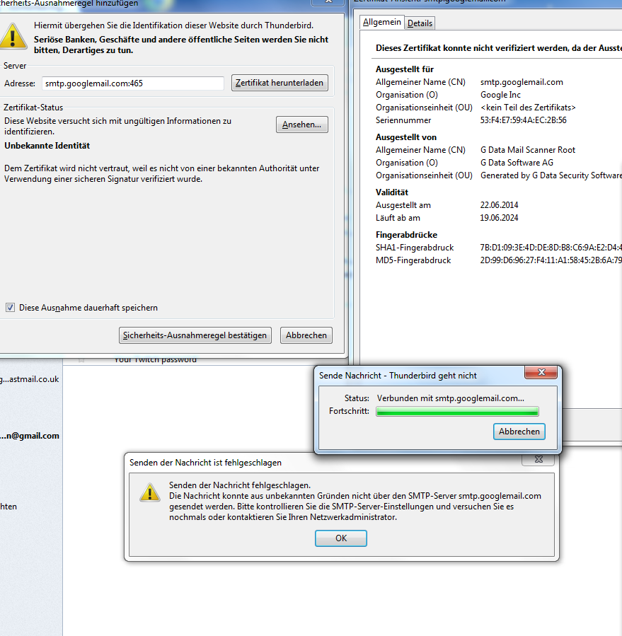 Mit dem gleichen Problem habe ich mich hier auch rumgeschlagen. Lösung sollte sein: in G Data unter Einstellungen->E-Mail-Prüfung das Zertifikat exportieren... und dann in den Thunderbird importieren: Extras->Einstellungen->Erweitert->Zertifikate->Zertifizierungsstelle->Importieren...