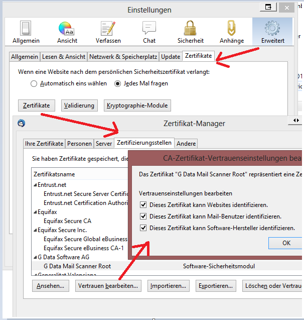 Nun noch auf G Data Mail Scanner Root gehen und die 3 Checkboxen aktivieren (Vertrauen bearbeiten...). Bei mir hat das geholfen.