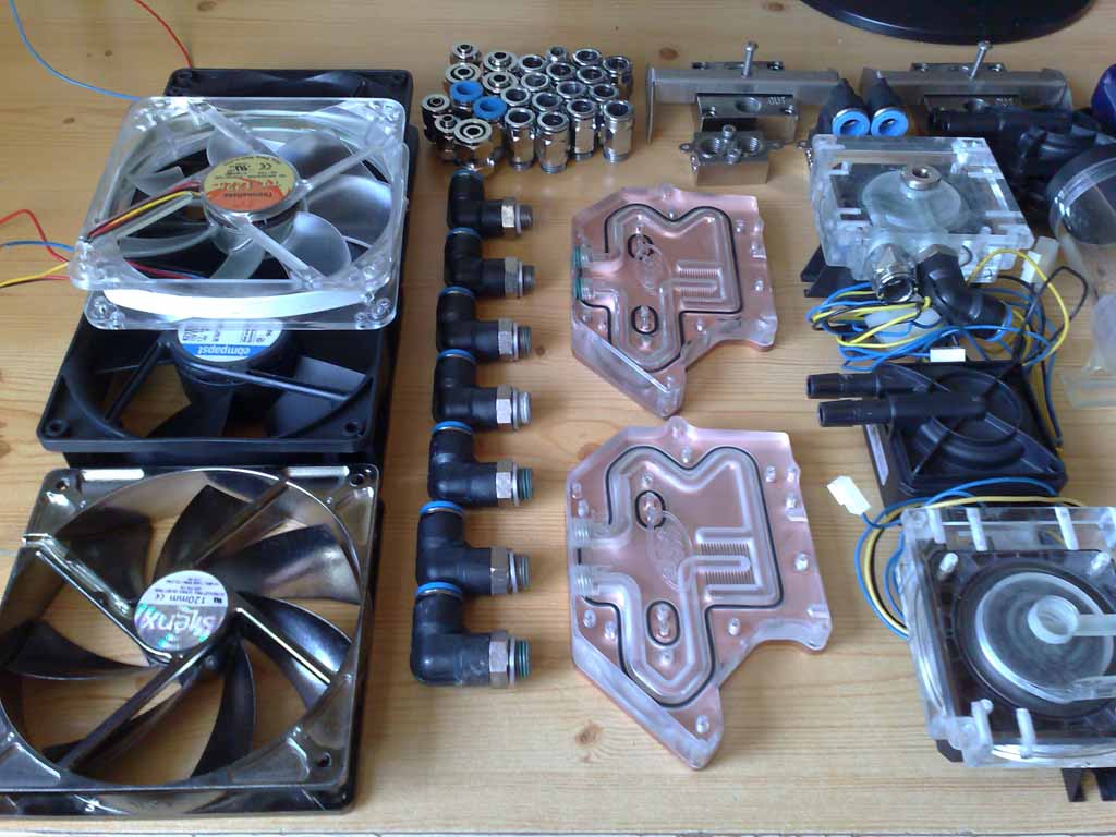 so hab nun mal Bilder von den Komponenten gemacht, die Radis weisen Gebrauchsspuren auf wie man an den Bildern sehen kann, es sind aber nur Kratzer an des Lamellen. Auf dem Bild sind 3 Laing Pumpen, wobei eine von den zwei Pumpen mit Plexiglasdeckel nicht mehr richtig funktioniert, man könnte von ihr allerdings dann ja Ersatzteile verwenden. Lüfter funktionieren alle noch einwandfrei waren auch fast nicht in Betrieb. Die ganzen Anschlüsse müssten alle noch ok sein, müssten dann eben beim Inbetriebnehmen überprüft werden. Bei den Grakakühlern fehlen die Wärmeleitpads und an einem wurde an der Seite etwas gefeilt (Bild).