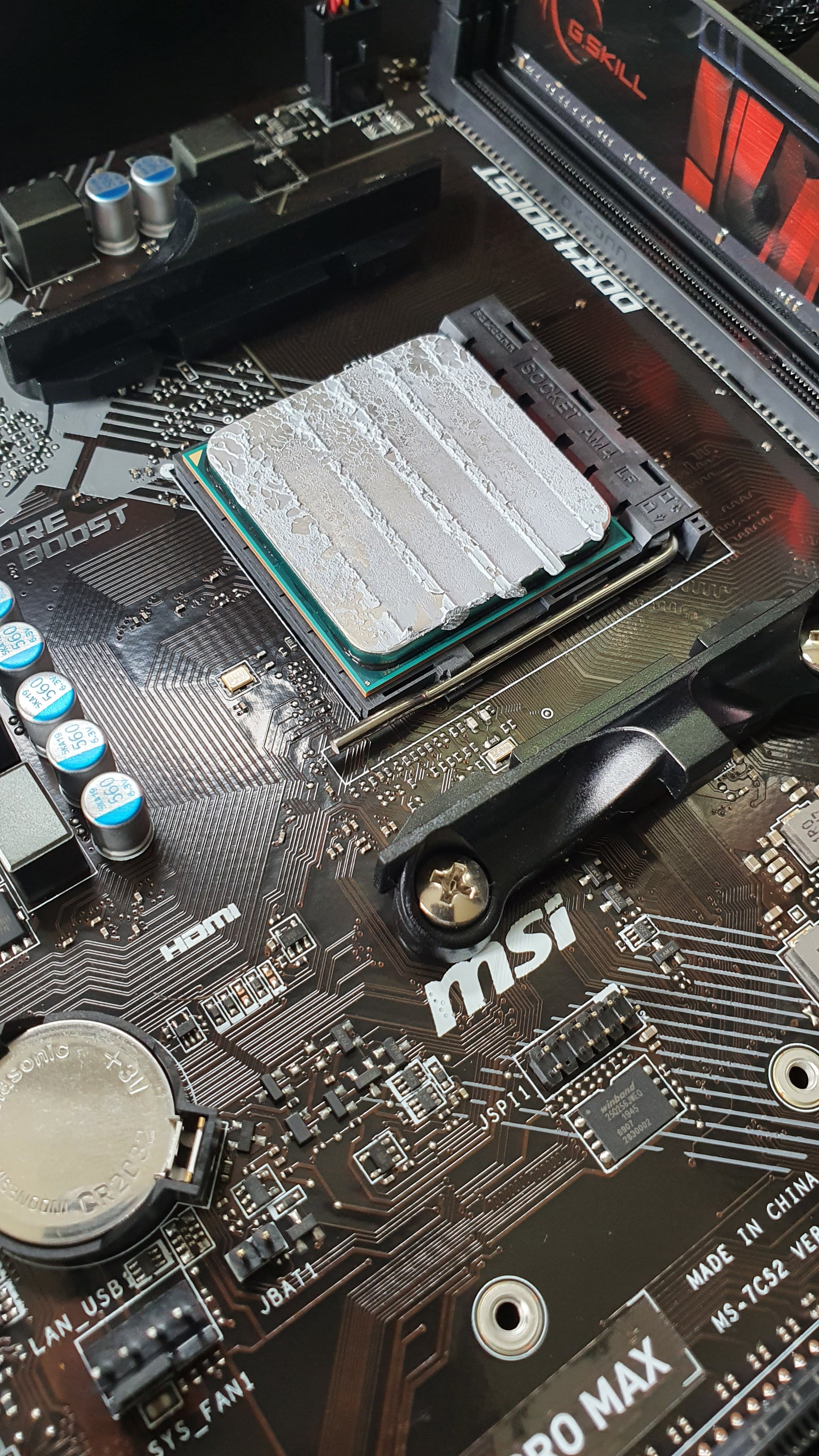 Kannst du mir bitte einen Gefallen tun, die CPU aus den Sockel nehmen und die Pins fotografieren, zusätzlich einmal den Sockel von oben? Falls die alle in Ordnung sind, tendiere ich auf ein fehlendes BIOS Kompatibilitätsupdate.