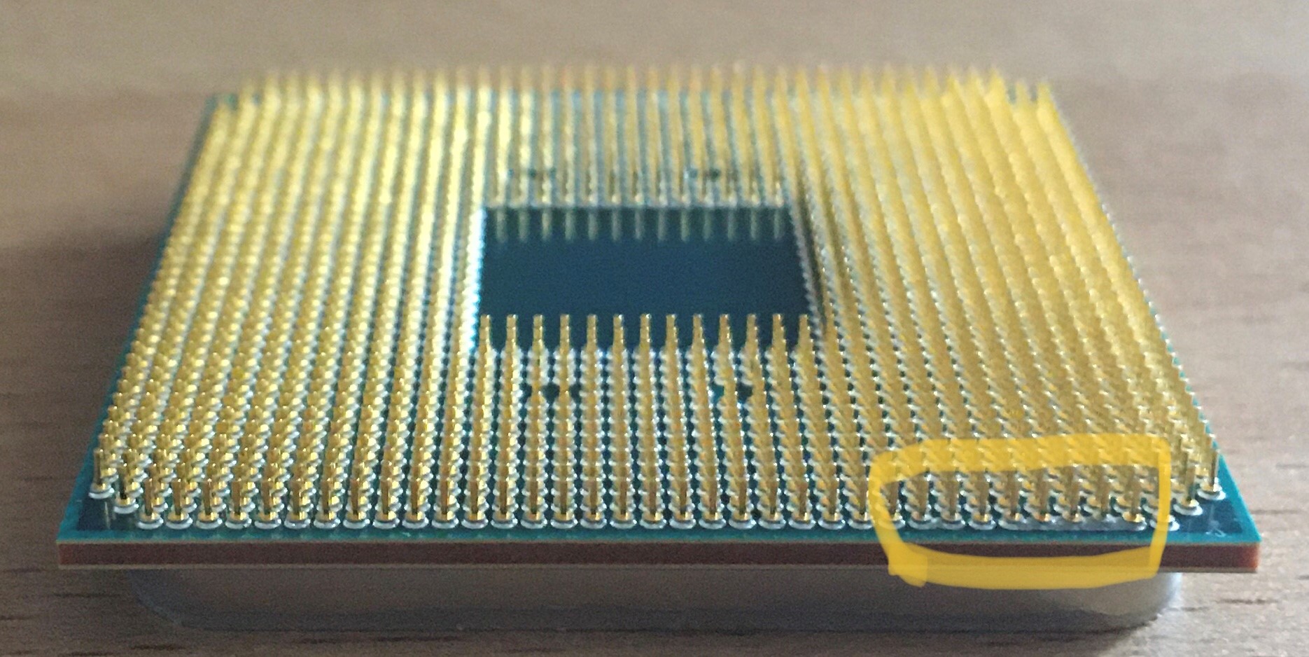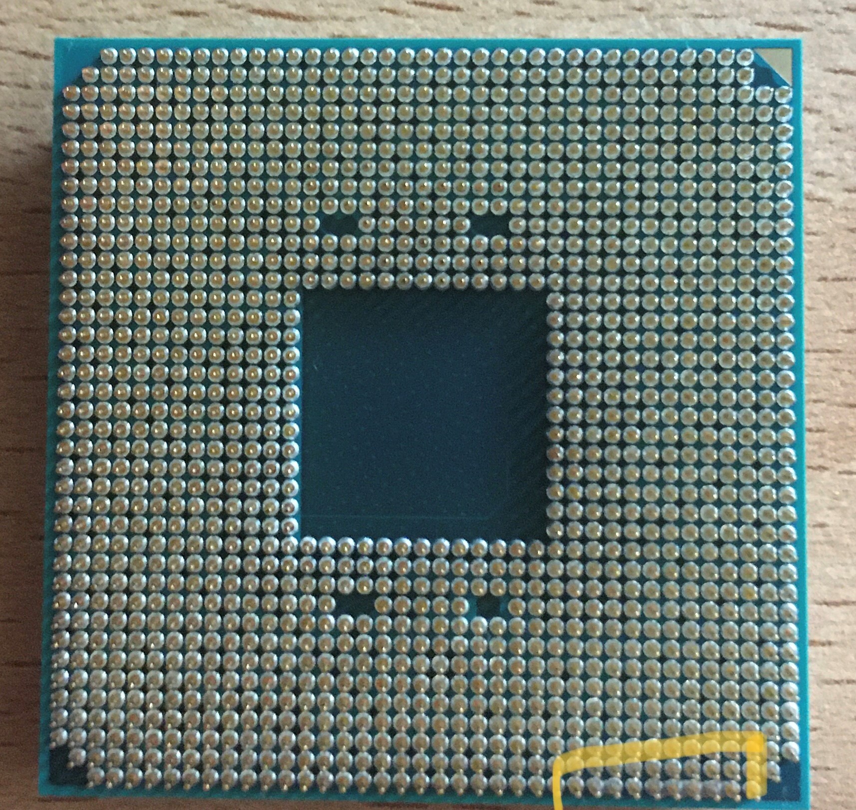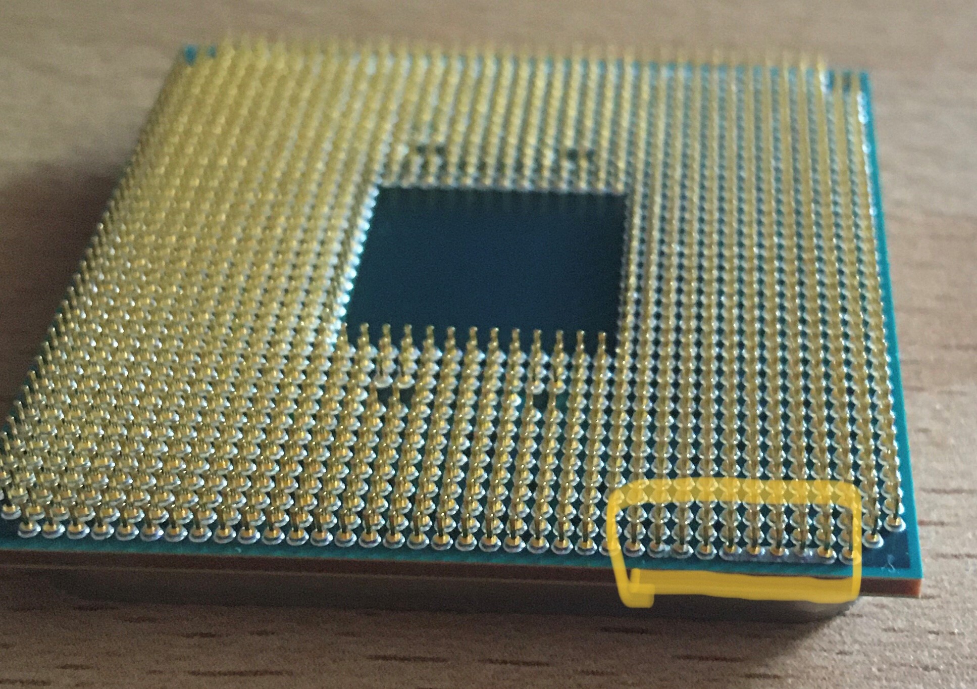 Daraufhin habe ich mir die CPU mal genauer angeschaut und festgestellt, dass in einem äußeren Bereich ein paar Pins scheinbar ab Werk "gebrückt-gelötet" wurden.
