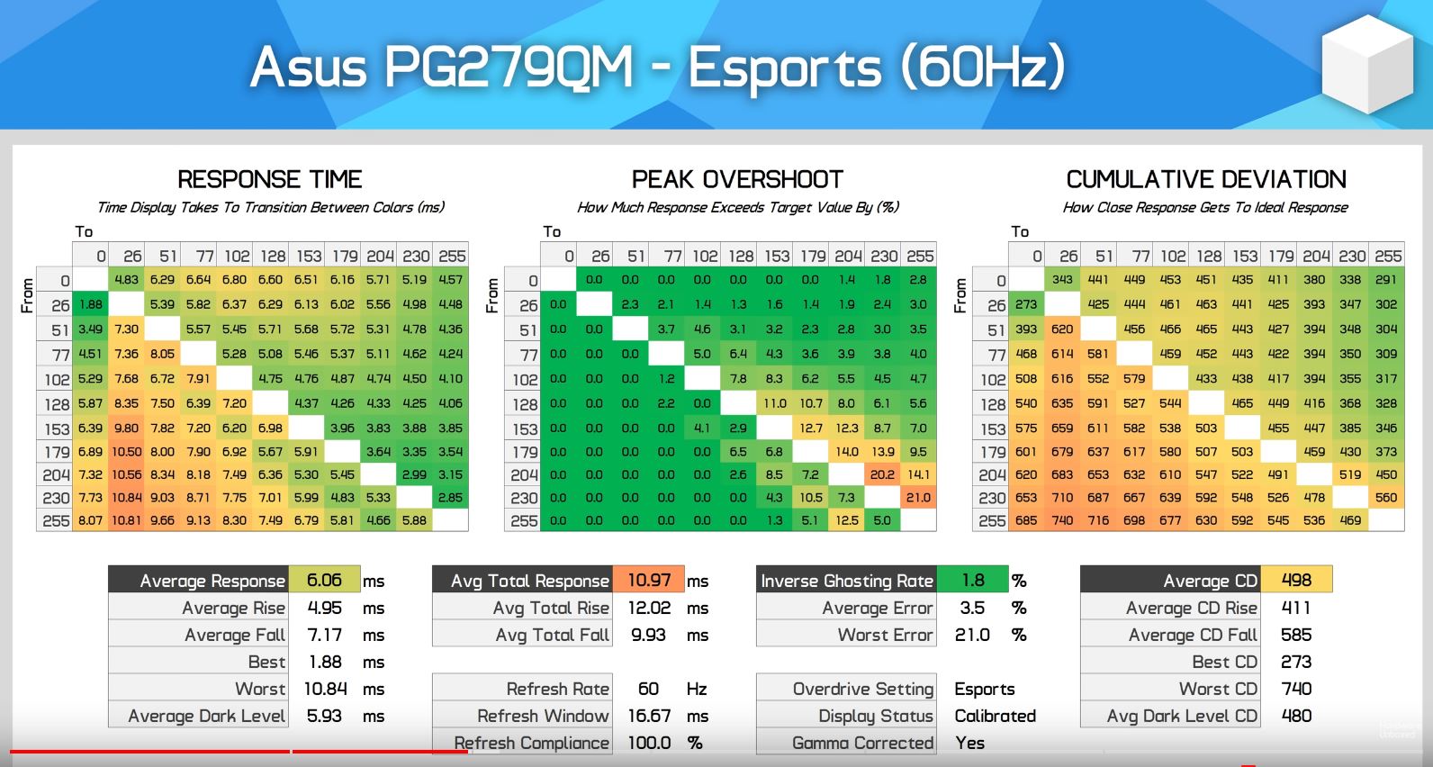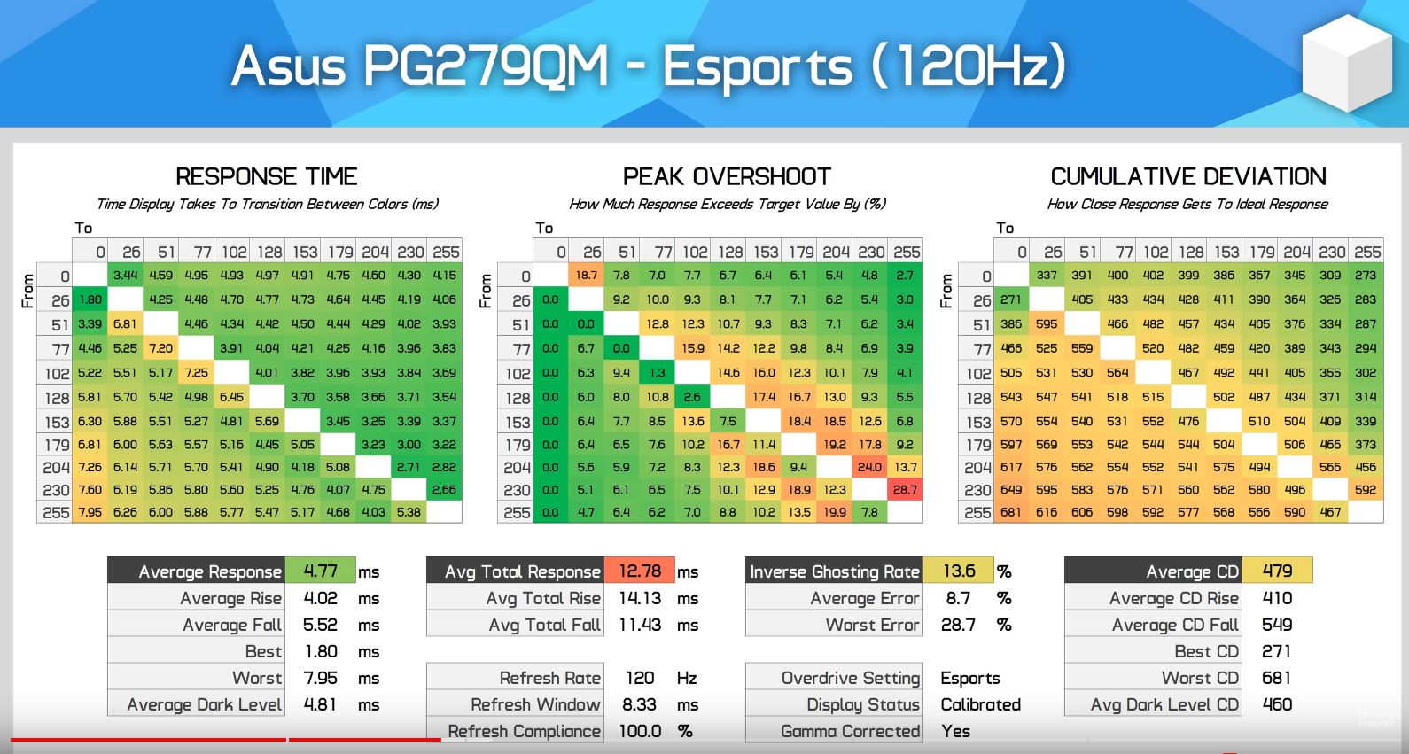 Naja schlussendlich komme ich dann aber immer wieder und lande erst einmal bei dieser liste mit möglichen monitoren. Nach erneutem lustigen bunten kästchen vergleichen was Response Times, Overshoot und Comulative Deviation angeht und wo ich versuche das einfach möglichst viele kästchen grün sind lande ich meistens beim ASUS ROG Swift PG279QM und denke mir, ok das wird er vermutlich sein. Beim unterschiedlichsten Hz zahlen sind hier die meisten kästchen grün und grün heisst glaube ich gut.