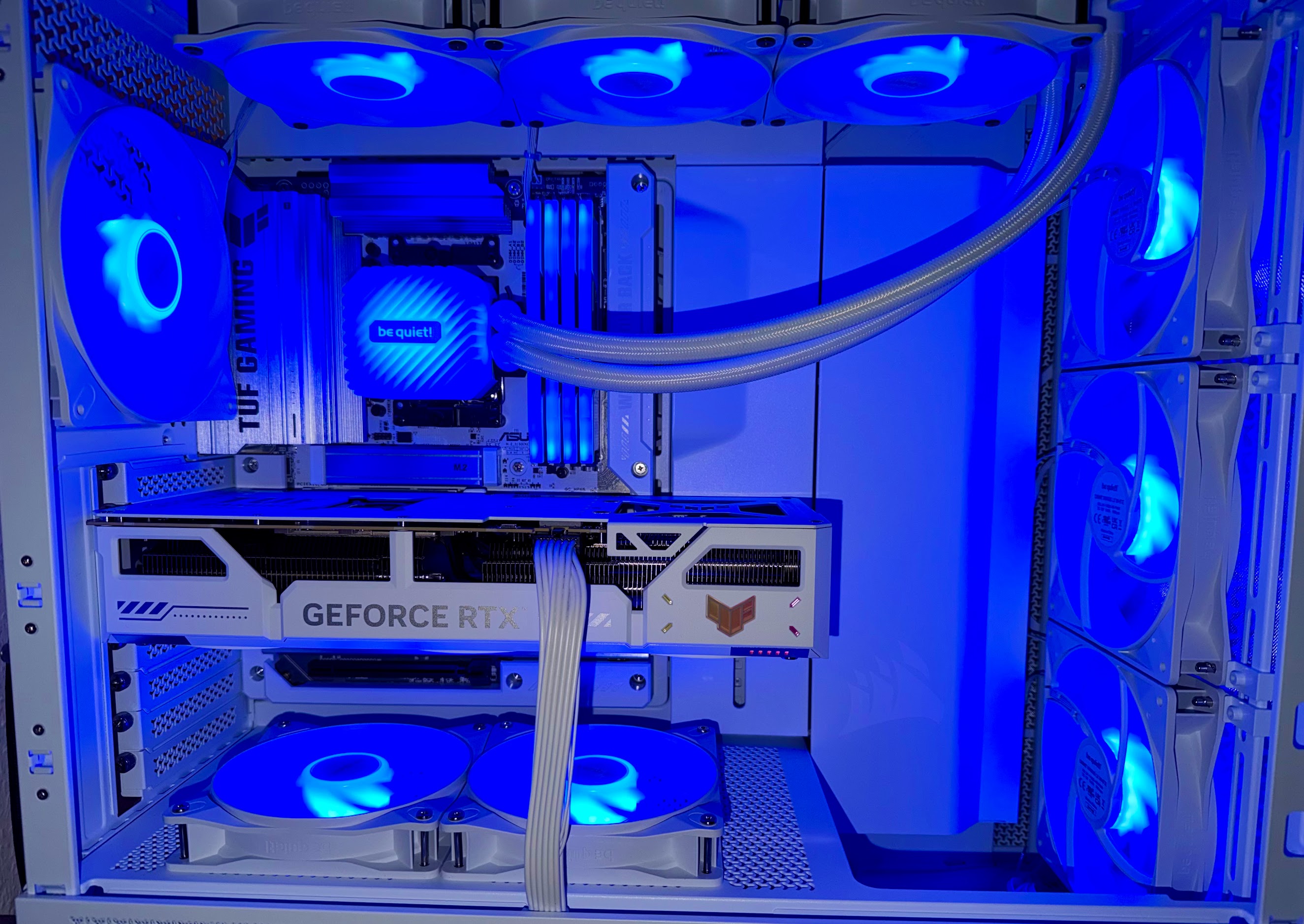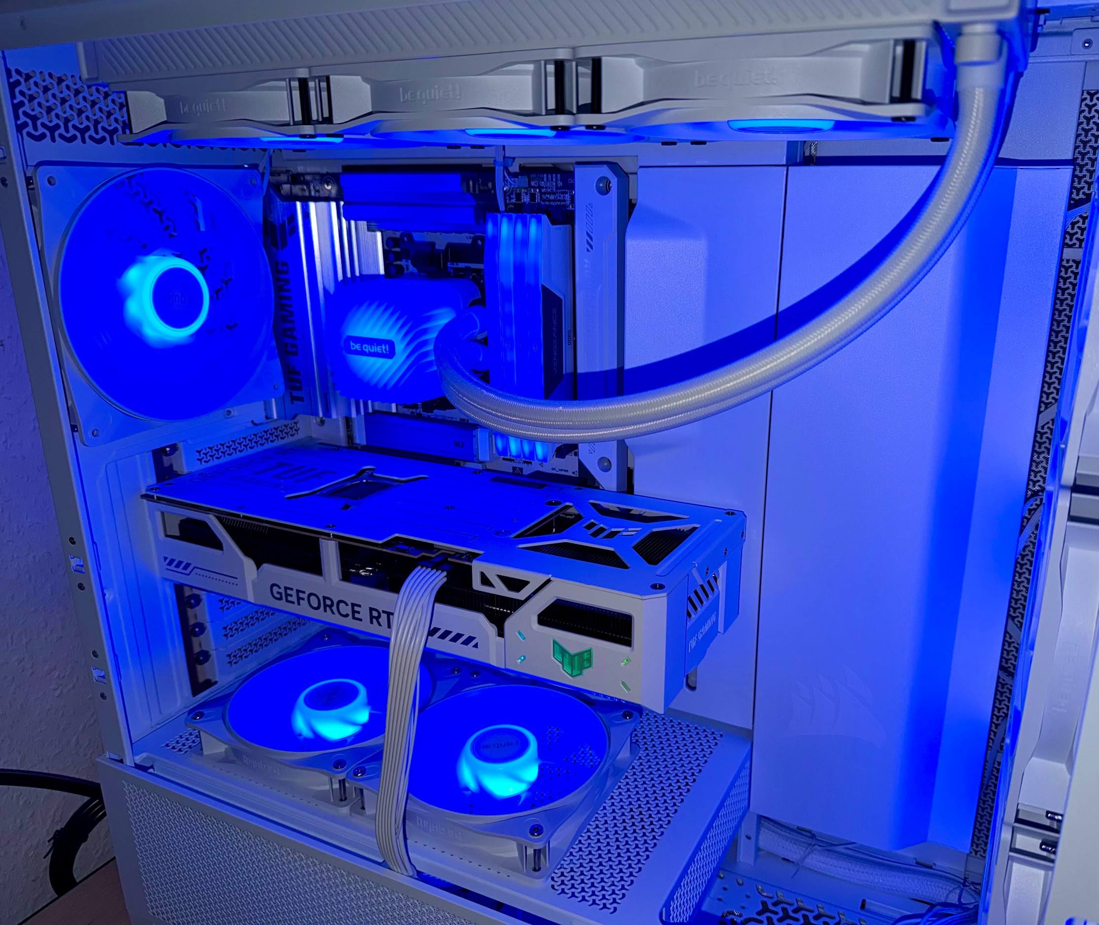 Die Lüfter der Grafikkarte drehen nicht mehr so hoch wie früher. An die 70°C unter voller Spielelast erreicht sie locker, aber bleibt leise. Die frische Luft kommt von unten und von vorne. Der unterste Frontlüfter bläst quasi unter das Blech, wo die Reverselüfter sitzen.