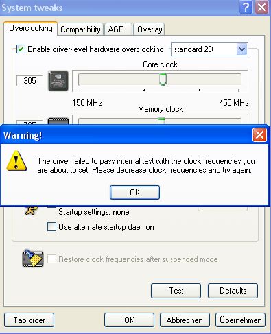 Mein PC macht, wie immer, was er will und nicht das was ich will. Jemand eine Idee, wiso ich diese Fehlermeldung bekomme? Scheint das gleiche zu sein, wie bei RivaTuner? Hab ich vielleicht eine falschen Takt der nicht möglich ist eingestellt oder sowas?