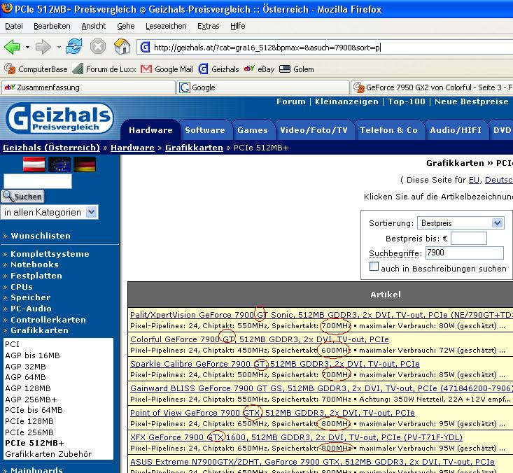 so, ich habe mir ne 7900gt mit 512mb gegönnt. ich muss sagen das ich zufrieden bin mit den teil. die karte ist von xpertvison, läuft standartmäßig schon 100mhz core schneller. lässt sich aber auch netter weise auf 630mhz takten, ram geht bis 390mhz. topf teil!!