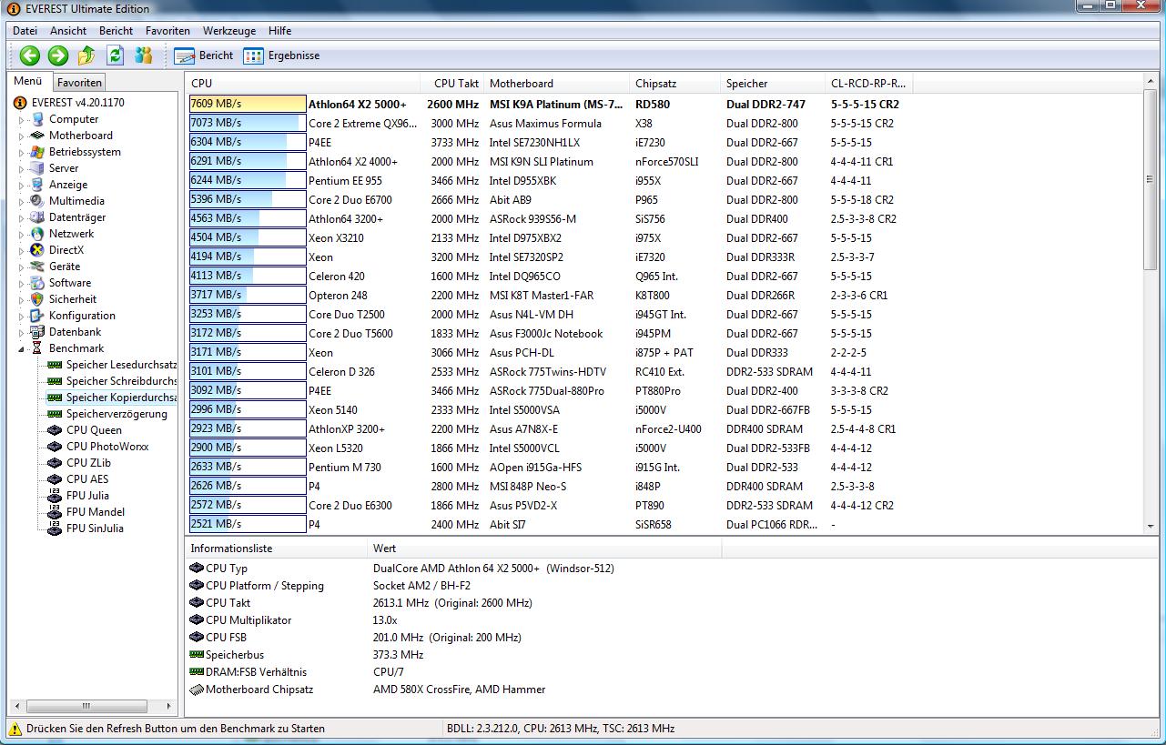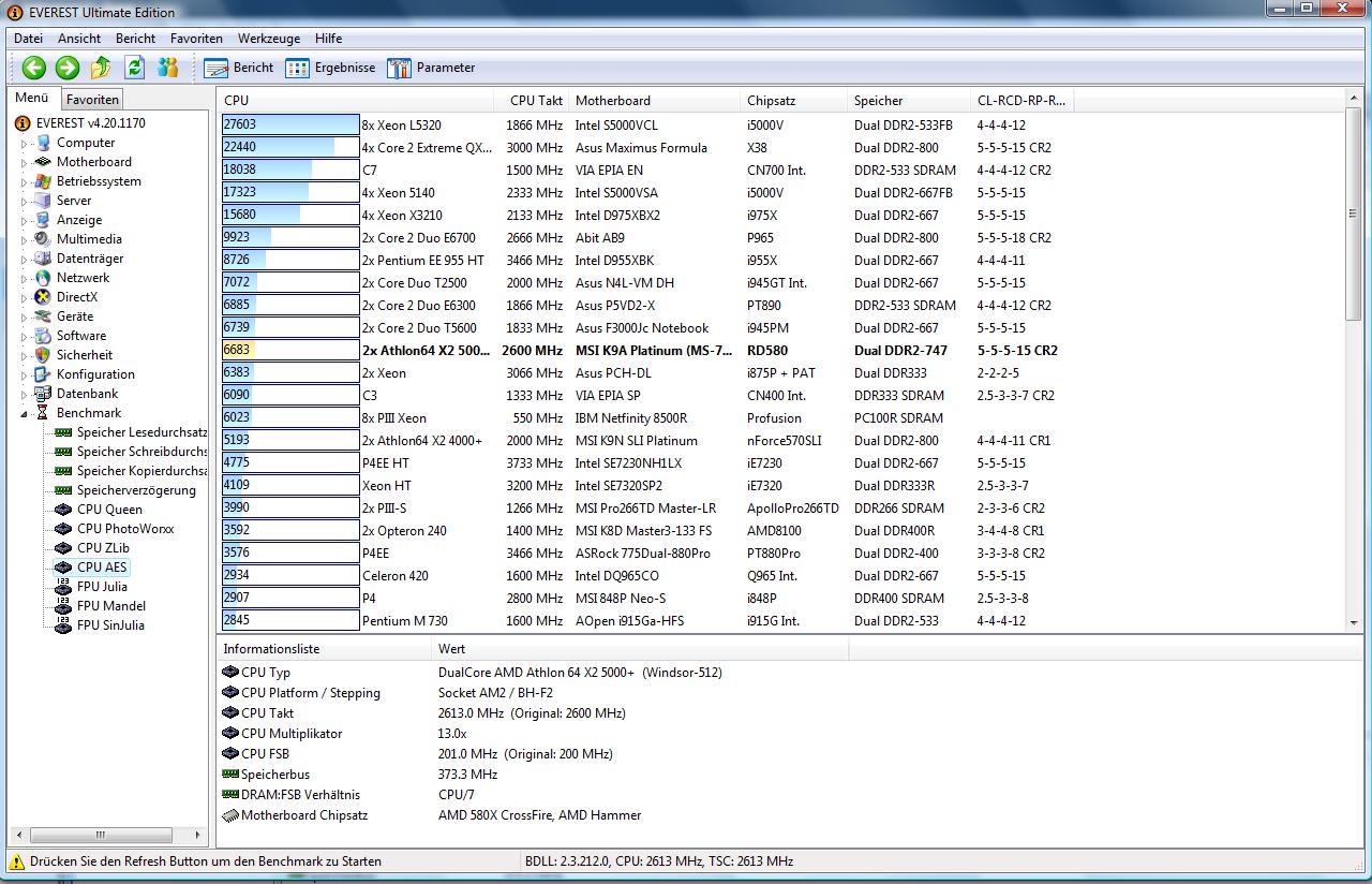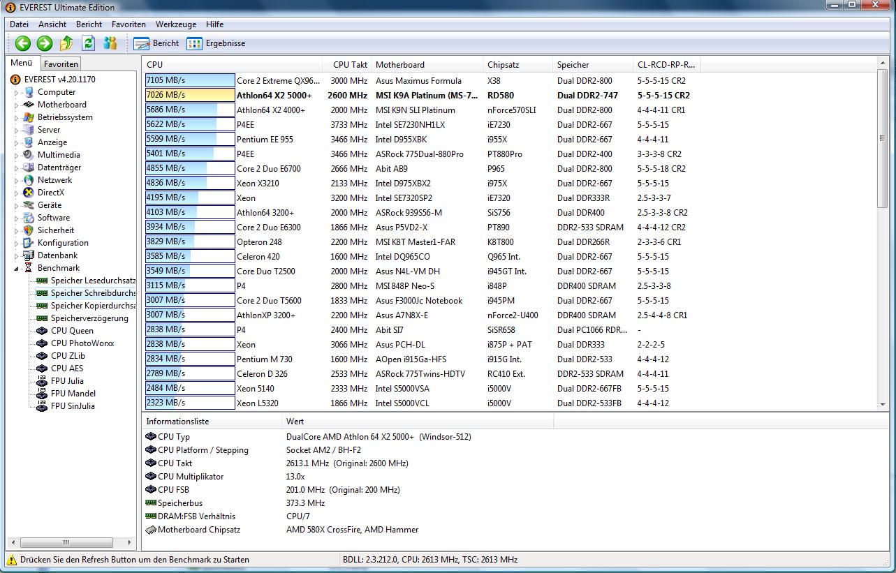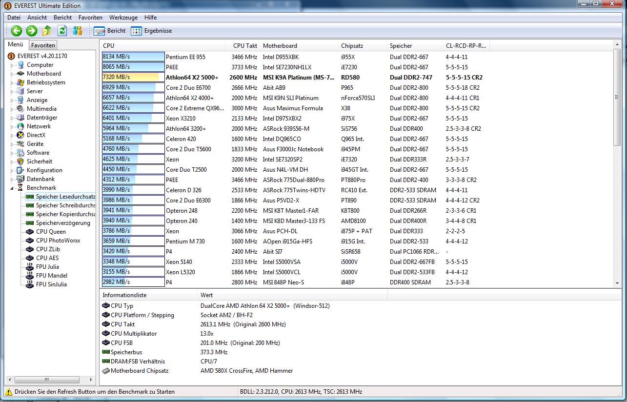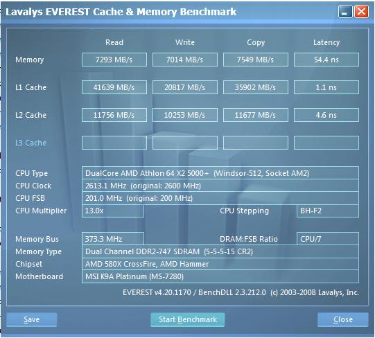 Everest hat immer einen Benchmark dabei. Was micht stutzig macht , ist dein DRAM-Frequency. Diese steht auf 373.4Mhz, das kommt mir irgendwie extrem komisch vor....