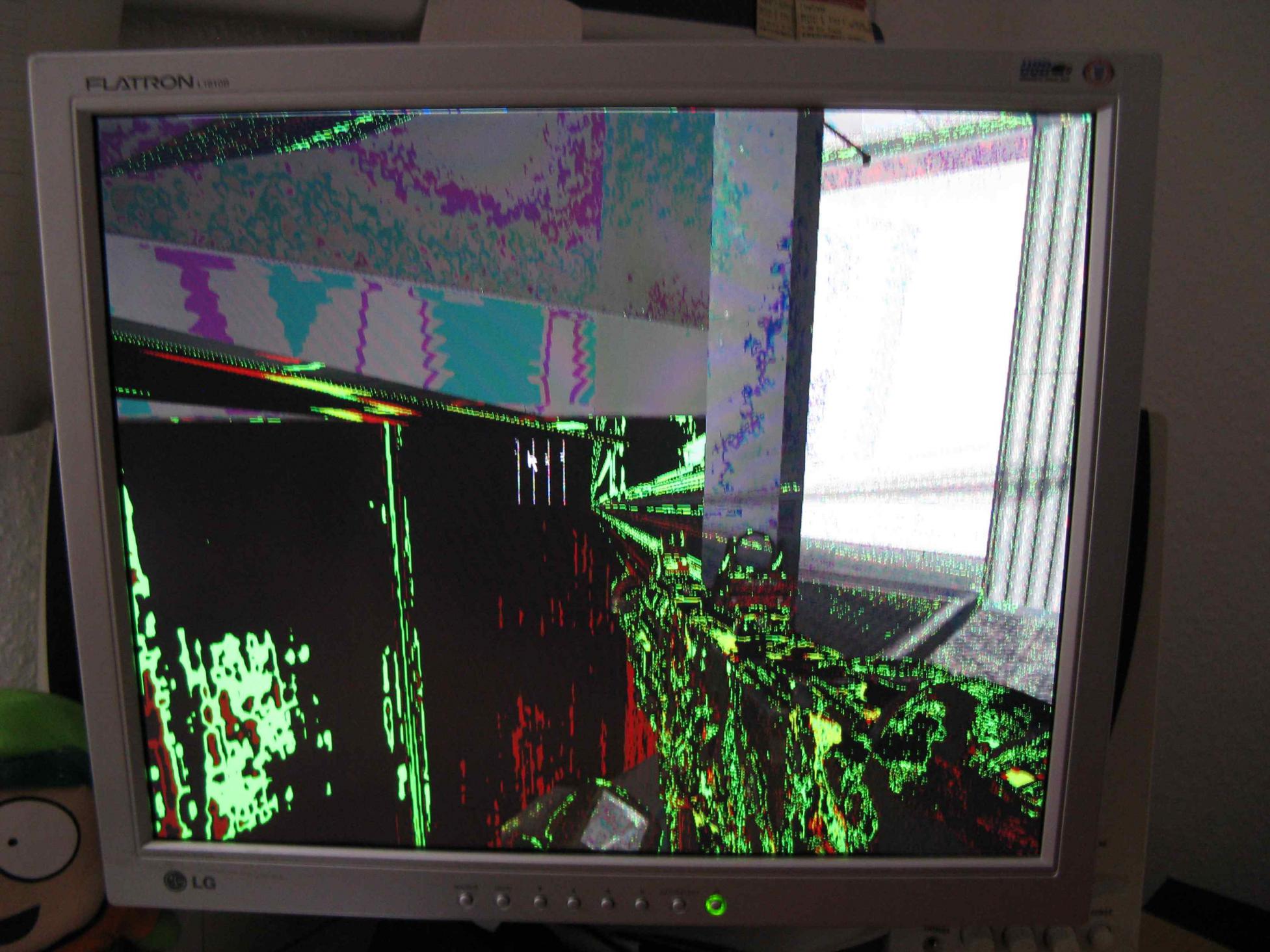 Hi, ich hab ein "kleines" Problem mit meiner Grafikkarte, wobei es vieleicht auch an was anderem liegt. Also bei manchen Games tretten nach einer unbestimmten Zeit erst Artefakte und Farbverschiebungen auf und wenige Sekunden später friert das Bild ein und nur ein Reset hilft. Dies geschieht z.B. nach etwa 5min Starcraft 2 Beta auf, oder 2-4h Modern Warfare 2 oder etwa 30min Plants vs. Zombies im Vollbildmodus. Dies ist sowieso sehr seltsam. Der Fehler lässt sich vermeiden wenn man in den Fenstermodus schaltet (bei Pvs.Z) oder er tritt zumindest seltener auf (mw2). Er trat auch einmal bei Portal auf und der freeze kam erst nachdem ich versucht habe ein screenshot zu machen, hab das ganze mal via Kamera aufgenommen und bei Xfire hochgeladen, aber passt auf der Sound ist laut und verstörend: http://www.xfire.com/video/2b2d11/ . Außerdem hänge ich zwei bilder an.