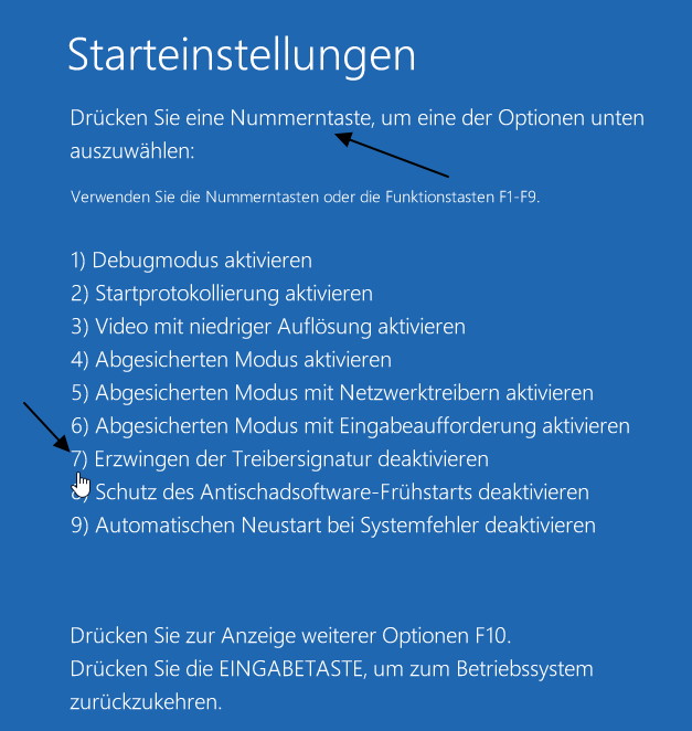 ° Mit F7 oder 7 wird Erzwingen der Treibersignatur deaktiviert.
