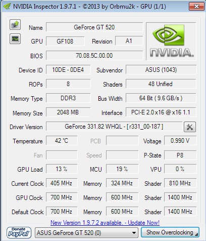 Mit "Nvidia Inspector" (siehe Screenshot) habe ich überprüft ob die Grafikkarte vielleicht überhitzt ist, aber 42 Grad klingen nicht übel, oder?