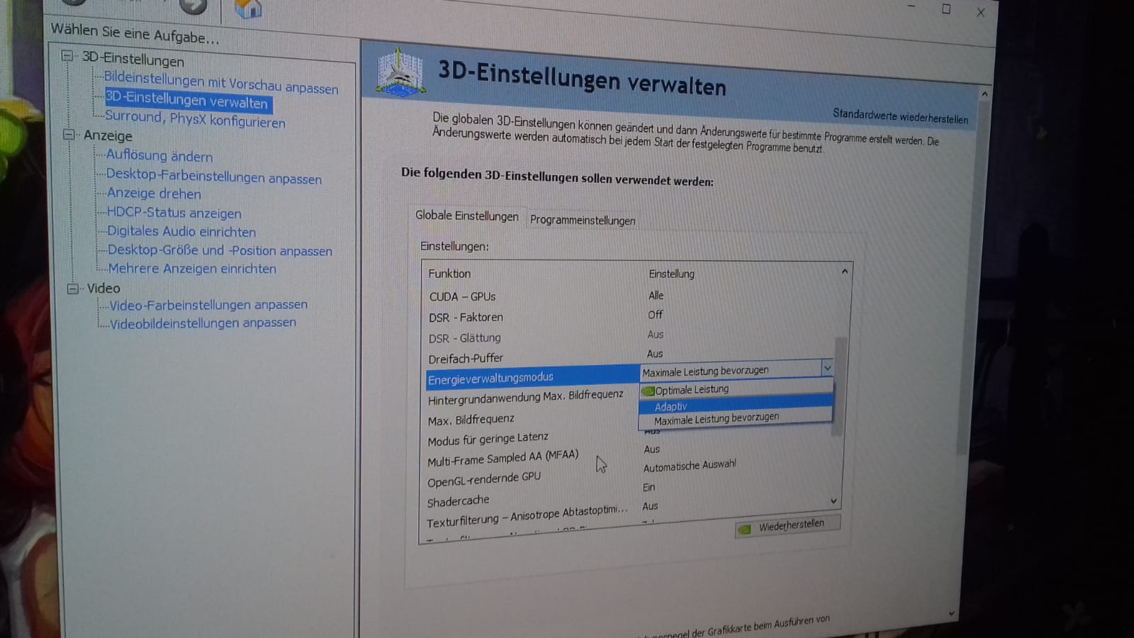 - dann habe ich heraus gefunden, dass wenn ich in der "Nvdia Systemsteuerung" unter "3D Einstellungen verwalten" den Energieverwaltungsmodus auf Maximale Leistung bevorzugen stelle, dass Problem nicht mehr auftritt.