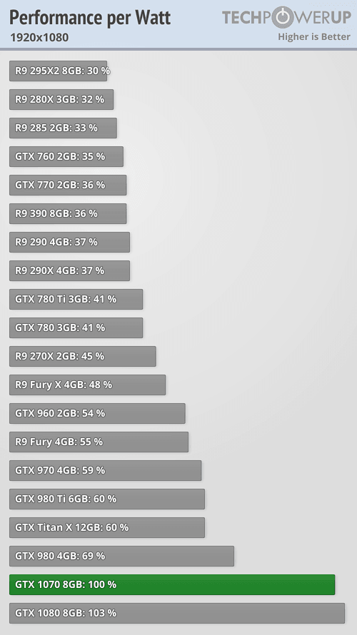 Und 100% stimmt natürlich, je nach Testzyklus weichen die einzelnen Reviews natürlich um +/-5% ab, bei TPU hatte die 1080 eine relative Performance von 118% bei einem relativen Verbrauch von 116% oder so, ergibt dann die Effizienz von 103% im Vergleich zur 1070 (da es ein Test der 1070 war ist diese der Ausgangswert)
