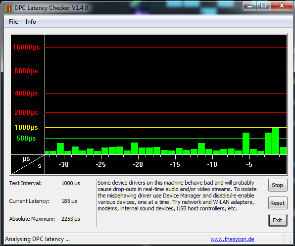 Eigentlich sollte bei dem Test, die Balken nicht in den roten Bereich gehen, das könnte in Games z.B. zu Framedrops führen, allerdings ist es bei Deinem Screen ja immer im roten Bereich. Vielleicht solltest Du einfach mal schauen, ob auch der neuste Audio u. Netzwerktreiber installiert ist, das könnte das Problem schon beheben.
