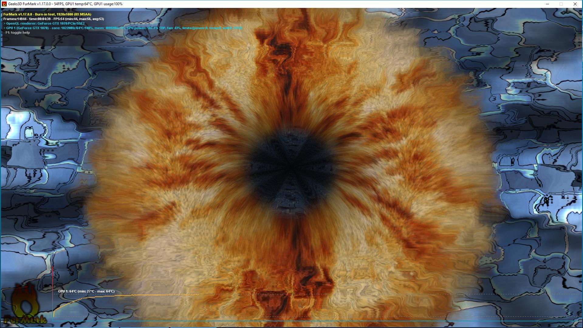 Du hast recht, ich habe stark übertrieben. Statt 61°C (lag wohl daran das ich gestern die Heizung im Wohnzimmer nicht so aufgedreht hatte wie heute) sind es nun 64°C ab ca. der ersten Minute Furmark. Hab noch etwas weiter laufen lassen weil er Donut dann langweilig wurde sowie der Temp Graph. Leider bringt der Screenshot nicht die Lautstärke rüber, aber egal mit was ich aufnehmen würde, es ist eh nichts zu hören Ich hab echt keinen Plan was man unter "miesem Kühler" versteht, zumal die Strix neben der Palit GameRock Premium die agressivste Stock Taktung hat. Diese wird aber leider vom Treiber, bzw. das Power Target küntlich heruntergesetzt sobald Furmark erkannt wird. 72°C mit euren 17XX Mhz Karten finde ich fragwürdig was mies ist.