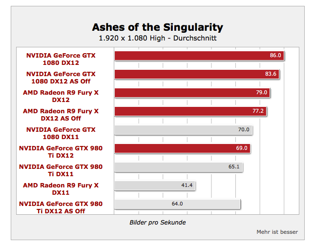 Doch sogar wegen der DX11 Umgebung. Denn AMD verliert übermässig viel Rohleistung bei DX11, wegen überhöhten Overhead. Das gleicht AMD aber in DX12 aus, weil dort die Rohleistung auch umgesetzt wird. Durch DX12 kann NV nicht viel gewinnen, weil nicht viel auf der Straße liegen bleibt. Schau dir die Karten 1080 mit 9 TFlops und Fury X mit 8,6 Tflops an. Dank geringer Overheads bei beiden in DX12 liegen beide ungefähr gleich auf, der Unterschied von ein paar Prozent für die 1080 liegt an dem mehr an Rohleistung von 0,4 Tflops. AS bewirkt ja auch nur eine bessere Auslastung der Shader, aber nicht die Erhöhung der Rohleistung..