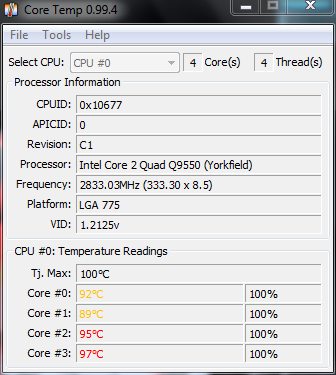 So die CPU Core 2 Quad Q9550 hat einen IDLE Wert von 50-60 Grad, bei Auslastung geht die bis 98 Grad teilweise, aber dort kann ich den Test auch 20 Minuten laufen lassen ohne dass sich der Rechner neustartet. Mit einem Boxed Kühler, der bei der CPU mitgeliefert wurde.