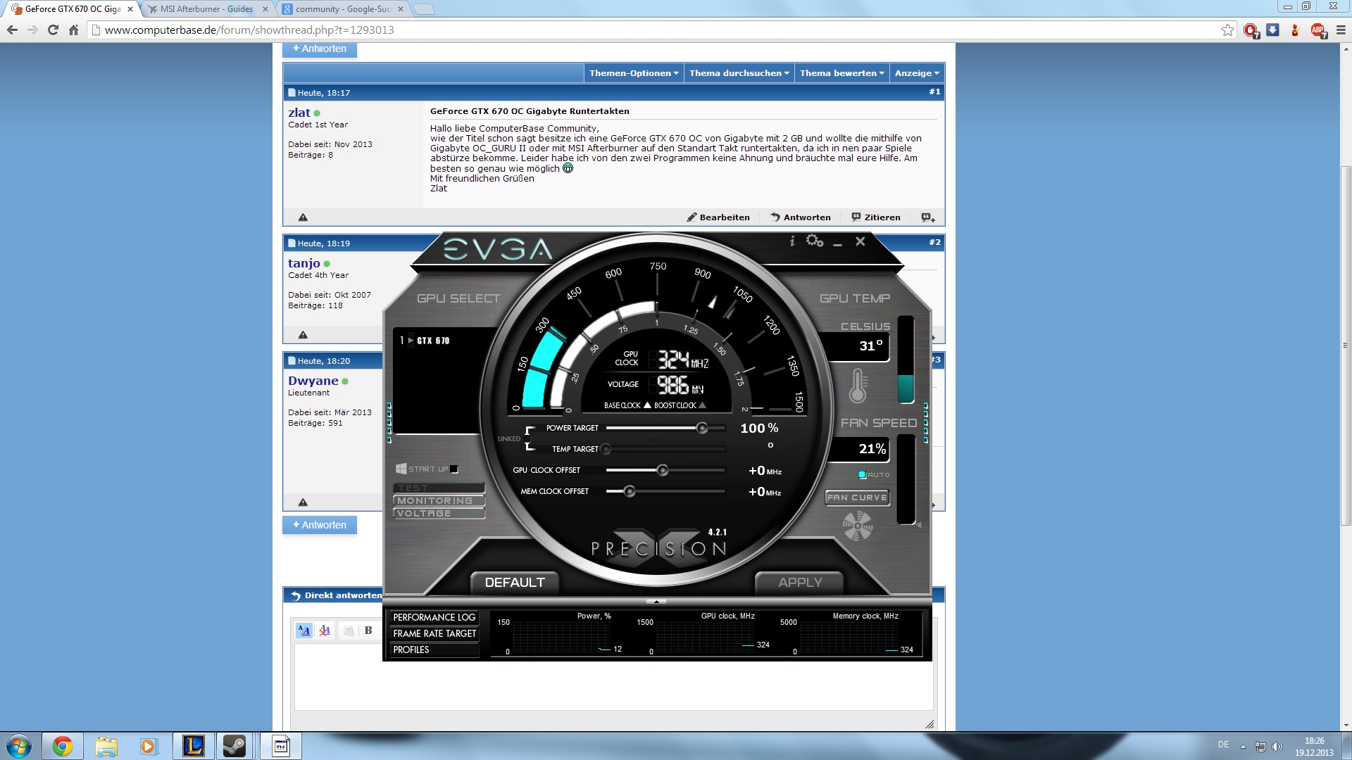 wie der Titel schon sagt besitze ich eine GeForce GTX 670 OC von Gigabyte mit 2 GB und wollte die mithilfe von Gigabyte OC_GURU II oder mit MSI Afterburner auf den Standart Takt runtertakten, da ich in nen paar Spiele abstürze bekomme. Leider habe ich von den zwei Programmen keine Ahnung und bräuchte mal eure Hilfe. Am besten so genau wie möglich