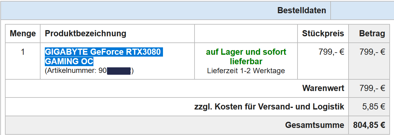 Ebenfalls zugeschlagenCrabman schrieb:Bei Alternate eine MSI 3080 Gaming X TRIO für 824€ gesichert, angeblich auf Lager, wenn ja kann ich sie vlt. heute noch abholen.