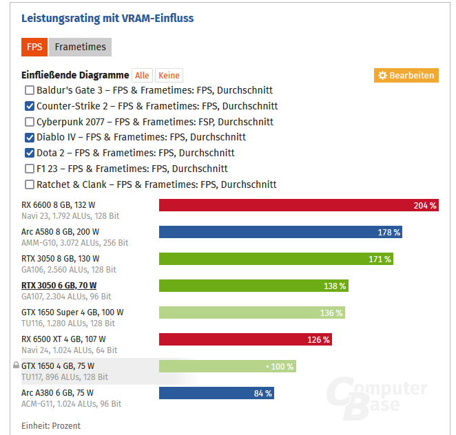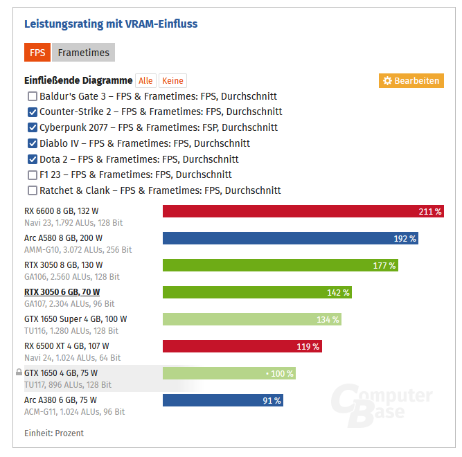 Ganz einfach, weil sie in mehreren Games vom VRam limitiert wird, damit gehört sie nicht in die Liste ohne VRam Einfluss, weil sie eben von diesem beeinflusst wird.Nero2019 schrieb:Warum ist die GTX 1650 bei der "FHD-Leistungsrating mit VRAM-Einfluss" dabei aber bei "ohne VRAM" - Übersicht nicht dabei?