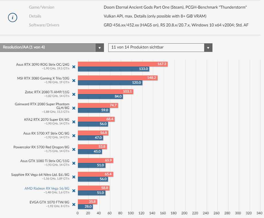 Für 4K reichen bei fast allen Titeln 8 GB, ein paar laufen mit 10/11 besser. Wer jetzt aktuell eine Karte mit 8 GB hat, muss die deswegen nicht unbedingt wechseln, aber mit Zukunftsperspektive sollte man eher auf 10 oder besser noch höher gehen. Auch hier wieder: Karten mit unter 10 GB sind ohnehin etwas langsam für 4K. 4K kommt gerade mit den neuen Konsolen und stärkeren Karten erst wirklich breit an, wie sich die Texturgröße dort zukünftig entwickelt, ist schwer zu sagen. Die 10 GB einer 3080 könnten etwas knapp gewählt sein oder Nvidia behält wie in der Vergangenheit auch Recht.
