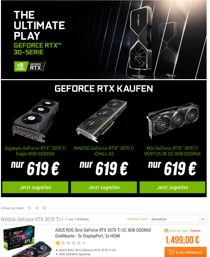 3070Ti Rog Strix.Dandelion schrieb:Sehr witzig NBB, sehr witzig... Kann man im Übrigen nix anklicken und auch die viel zu teure Strix, die sofort ab Lager da sein soll, ist NICHT da.