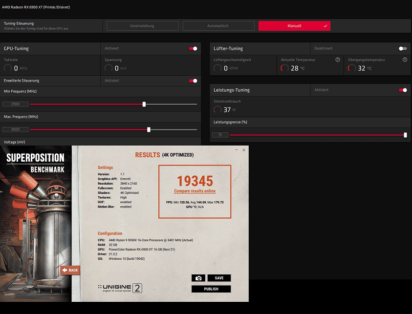 Unter Luft fahre ich mit MPT: 289Watt, Adrenalin Automatisch: Übertacktet, ganz gut (20500 GPU Score)