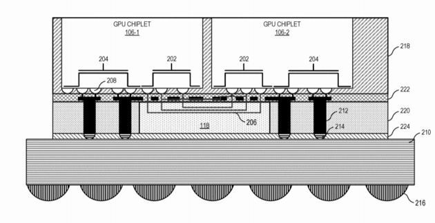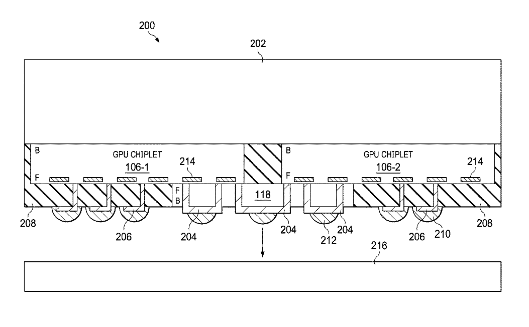 Das ist die MI 200, die entsprechend des Patents US20200409859 "GPU CHIPLETS USING HIGH BANDWIDTH CROSSLINKS" umgesetzt wurde. 118 ist die passive Siliziumbrüche die die beiden GUP Chiplets 106-1 und 106-2 verbindet. Im Patent heißt 118 passive crosslink.
