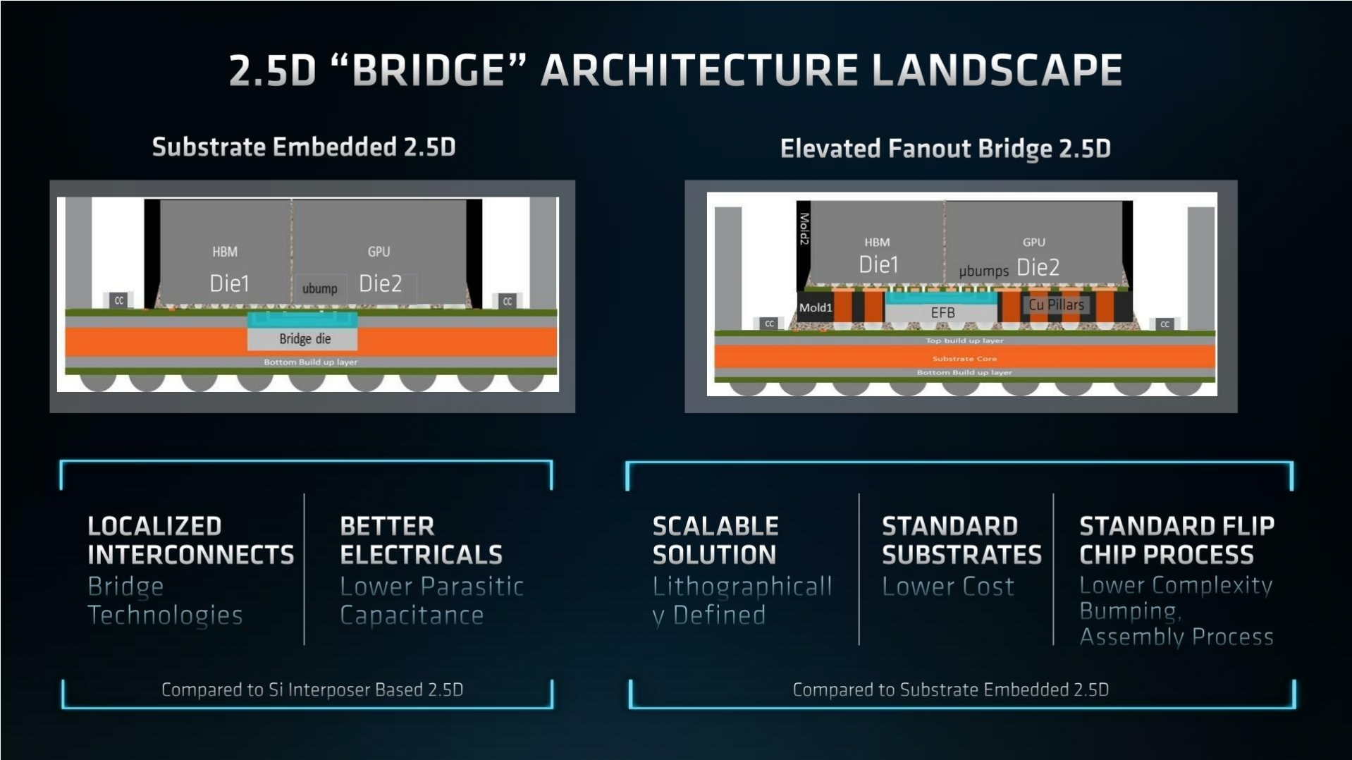 Wäre RDL 222 direkt mittels Microbumps mit dem Substrat verbunden, hätten wir ein klasischen FanOut wie TSMC InFo oder Fan-Out Chip on Substrate (FOCoS) von ASE. Die oben gezeigte Variante entspricht sFOCoS von ASE. Die Variante mit Siliziumbrücke bei TSMC heißt InFO-L(SI). Ob TSMC auch Kupferposten verwendet weiß ich momentan nicht. Beides ist vergleichbar mit Intels EMIB.
