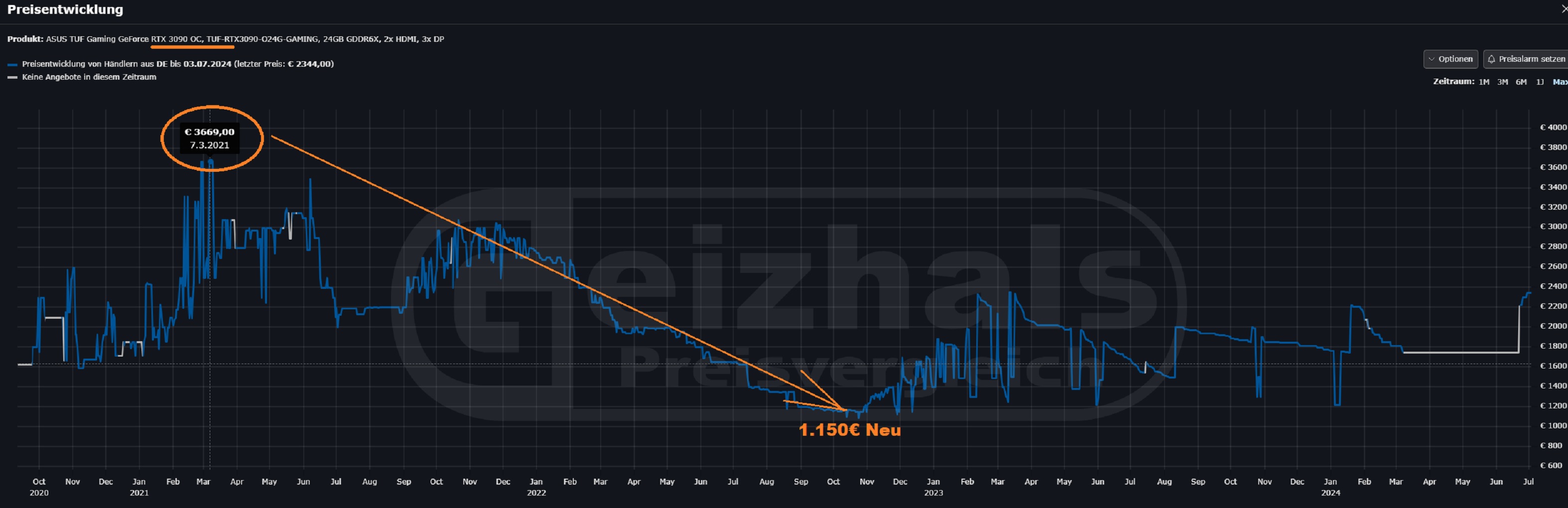 Der UVP der RTX 3090 TUF OC war übrigens 1599Euro. (Das was ich im Internet dazu gefunden habe, ich lasse mich gern verbessern). Entsprechend war der "Preissturz" real vom UVP eine ganz andere Nummer. Und wie du in deinem Diagramm selbst siehst, ging der Preis danach wieder ordentlich rauf.