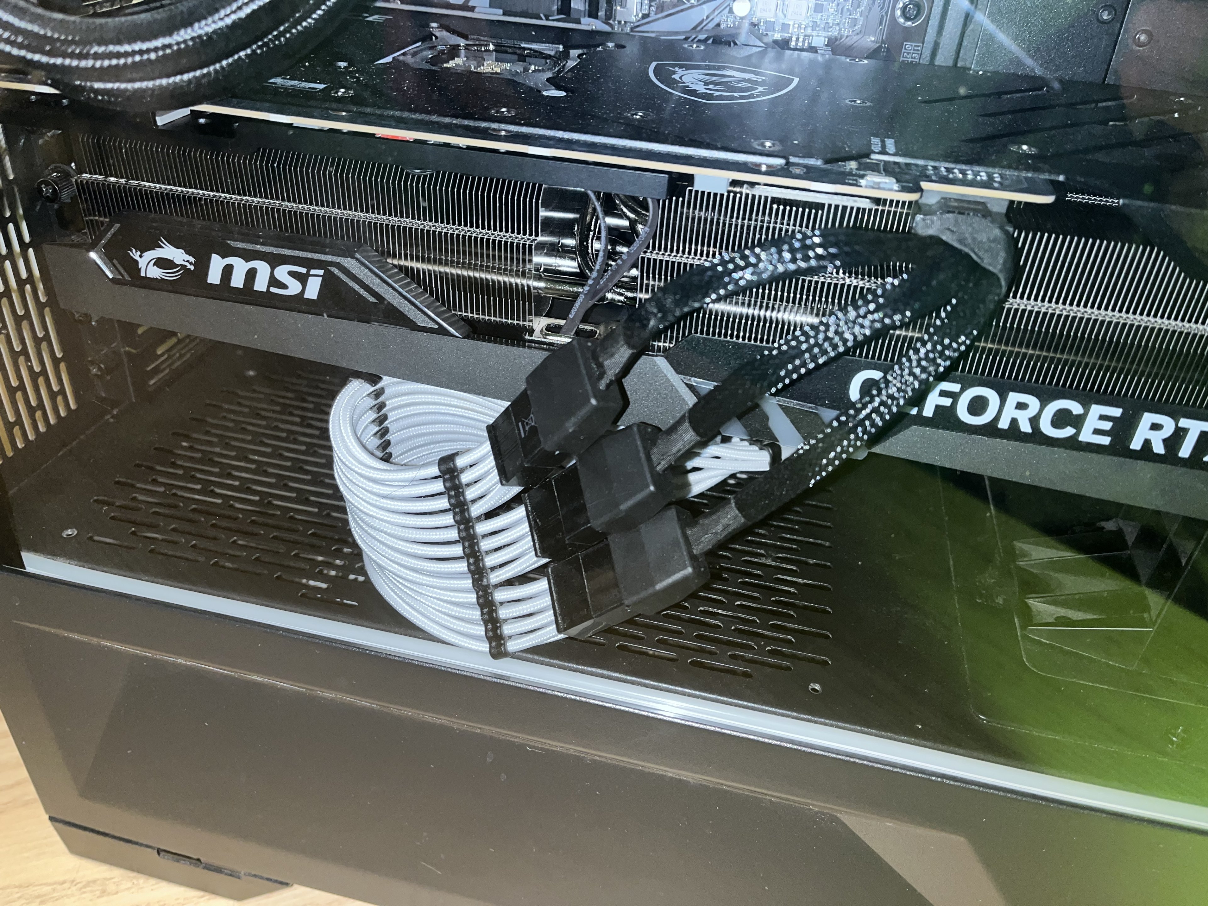 Der Stecker sieht aus, wieder Adapter, der bei der 3090ti mitgeliefert wurde und da fehlen die Sense-Pins, wenn man davon ausgeht, dass der Clip zum einrasten auf der Rückseite ist, oder der Clip zum einrasten fehlt komplett. Abgesehn davon, dass das Bild vom fertigen System so aussieht, als wäre der Adapter direkt am Anschluss geknickt worden.