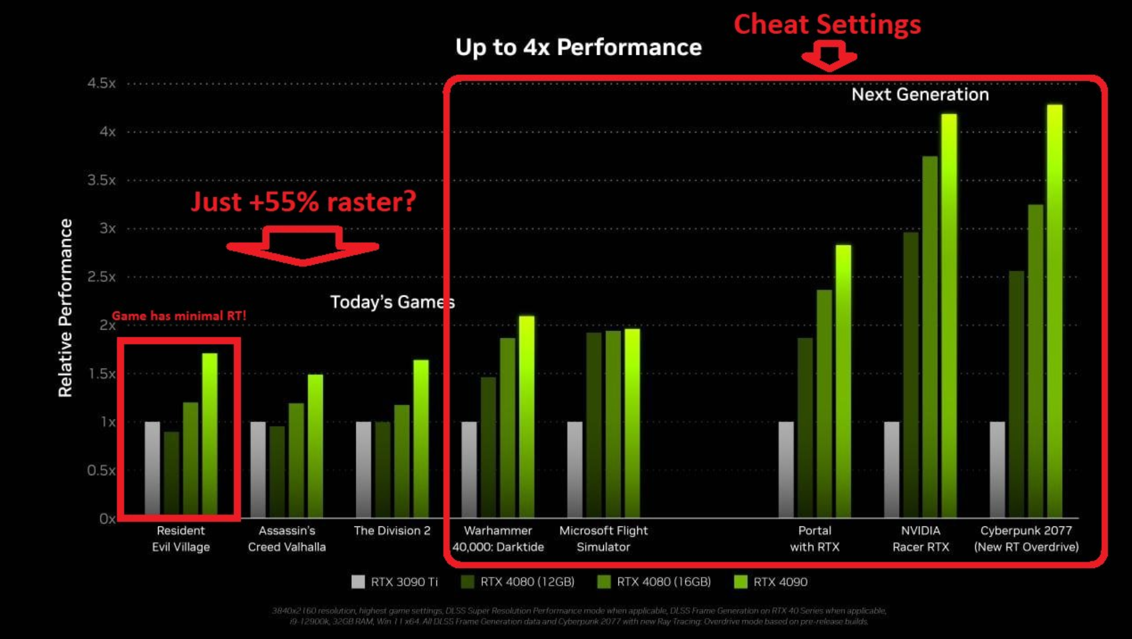 Und schon sind aus 2-4X 3090Ti in diesem Bild nur noch 1.5X-4.3x geworden, wobei die klassischen Spiele ohne DLSS und RT sich alle im Bereich 1.5-2x aufhalten^^