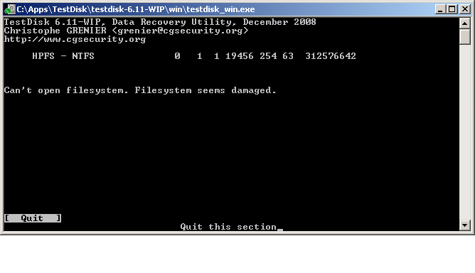 Kann mir jemand helfen die NTFS-Partition wiederherzustellen? Es war nur eine einzige Parition auf der ganzen Platte. Ich habe Hoffnung, dass eine Rettung möglich ist, denn PhotoRec hat in einem kurzen Testlauf in einer Minute über Hundert Dateien gefunden (hauptsächlich Windows-Logdateien und DLLs).