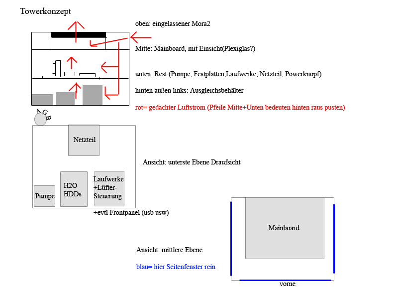 Deshalb habe ich mir gedacht, ein genau für mich abgestimmtes Gehäuse wäre wohl etwas passender, ein Gehäuse das, wenn man es von außen betracht ordentlich aussieht (und auch von innen aufgeräumter wirkt ^^) sowie eine passende Ausrichtung aller Komponten. Da ich schon länger die Idee eines Eigenbaugehäuses pflegte, kommt mir nun die Gelegenheit dazu. Im Anhang habe ich dazu eine hoffentlich durchschaubare Skizze gemacht. Es soll also eine Art Würfel werden.