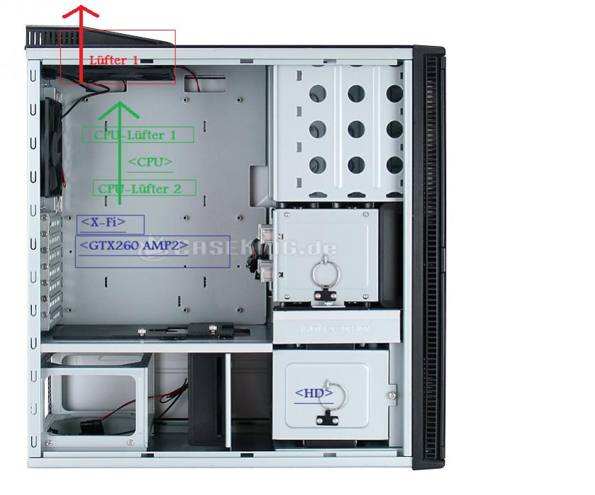 - 2 CPU Lüfter am CPU Kühler die nach oben blasen