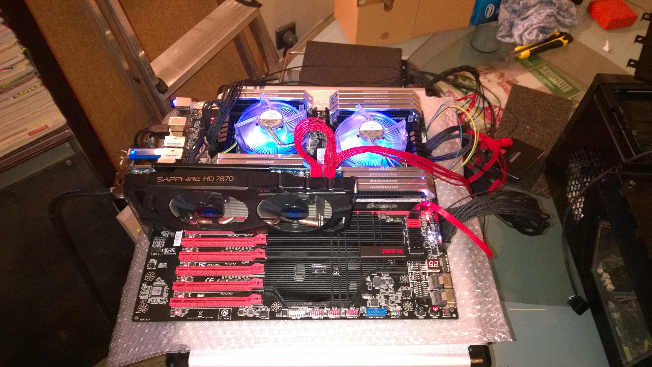 Momentan läuft das board ohne Tower mit einer Test Graka ( 7970 ) von mir und zwei Intel CPU Lüftern