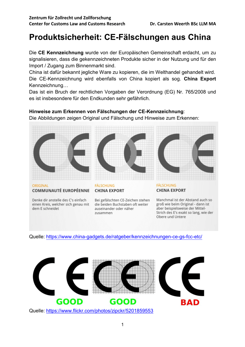 Falsche CE-Kennzeichen erkennt man daran, dass die beiden Buchstaben zu nahe aneinander stehen, der Mittelstrich von dem E zu weit hinaus ragt und rechtsbündig ist. Das echte "CE Kennzeichen" ist abgestimmt und wenn Sie das "C" als Kreis darstellen, dann überschneidet es sich mit dem "E".
