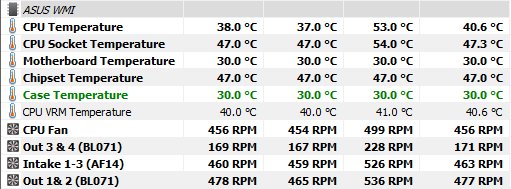 Intake (2x Noiseblocker): M 459 RPM / O 0 RPM / K 0 RPM