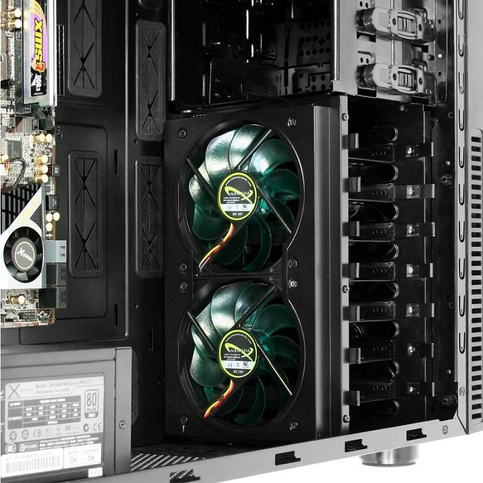 kleiner Hinweis: Bei der Montage von Lüftern an den HDD-Käfigen bitte auf die Länge der verwendeten Grafikkarte achten.