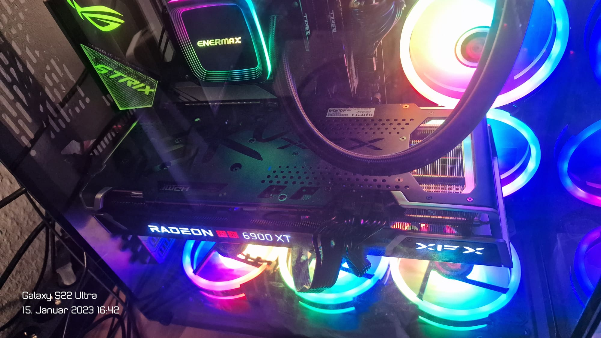 Wie zu sehen, ist die Grafikkarte schon ziemlich groß und die Kabel drücken extrem am Glasgehäuse Fest. Den PC kann man eigentlich sogut wie gar nicht anfassen da jede stelle wo die Grafikkarte ist einfach so heiß ist das man sich schon verbrennt. Mit FPSMonitor in einigen Games konnte ich messen das die Karte 80° heiss wird, mehr nicht, eigentlich standard und die CPU irgendwo bei 60-70° taukelt. Übertaktet habe ich die karte nicht, die CPU ist automatisch auf 4.300MHz oder 4.400MHz getaktet ich denke über das Mainboard durch das XMP Profil.