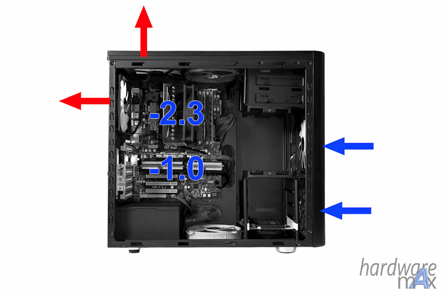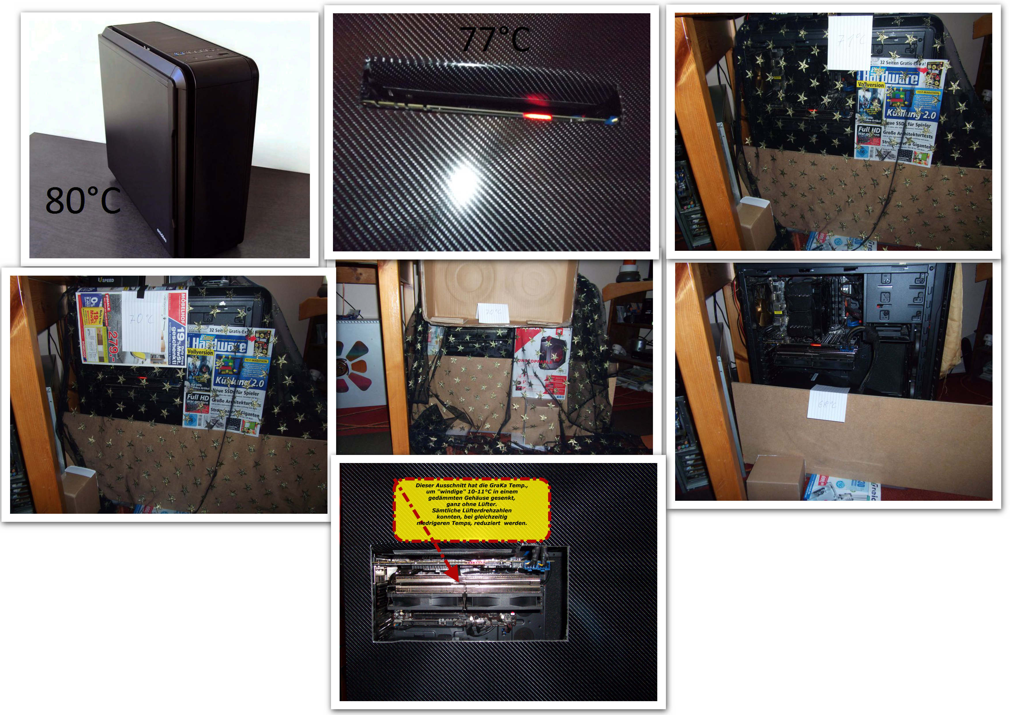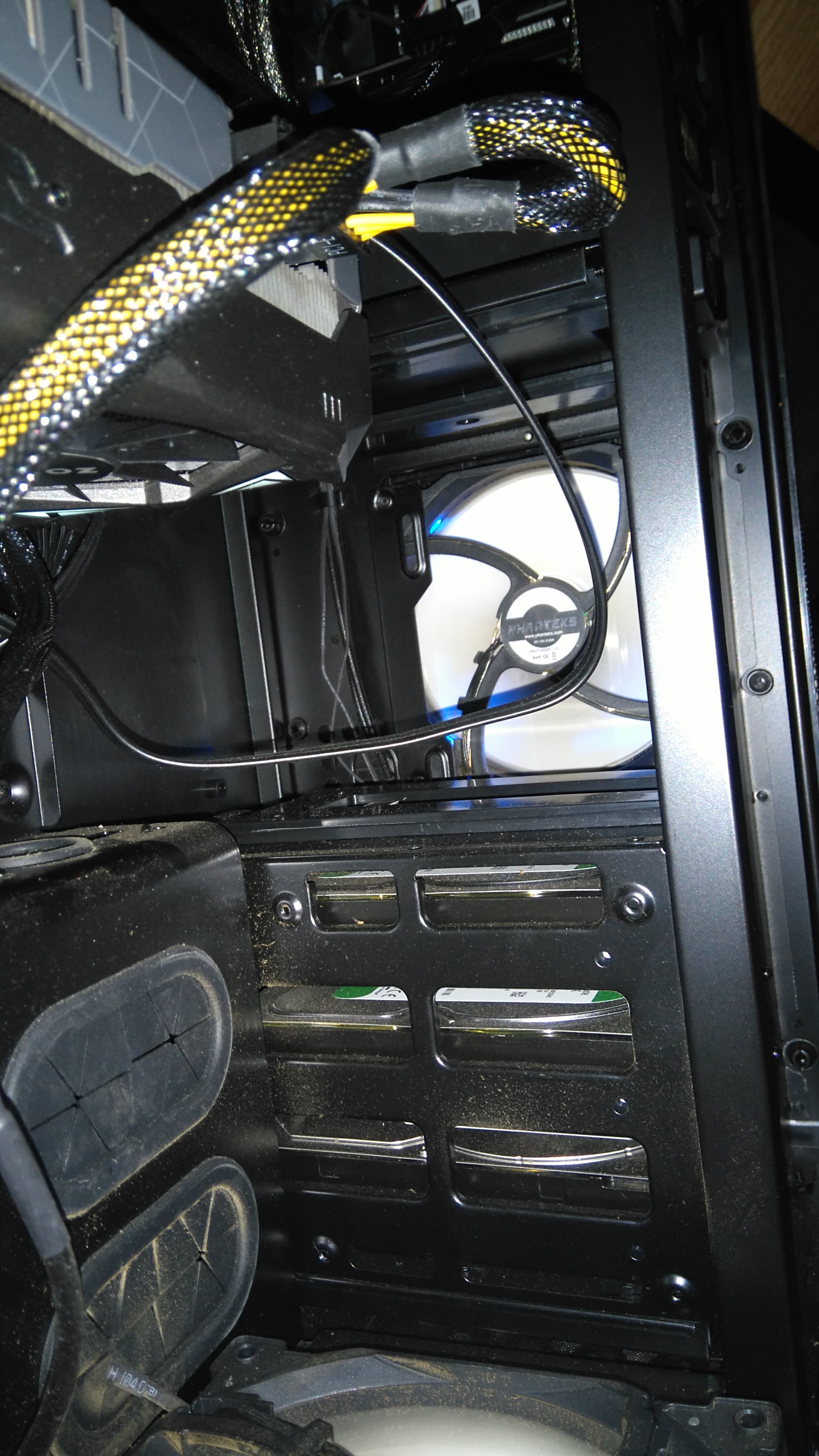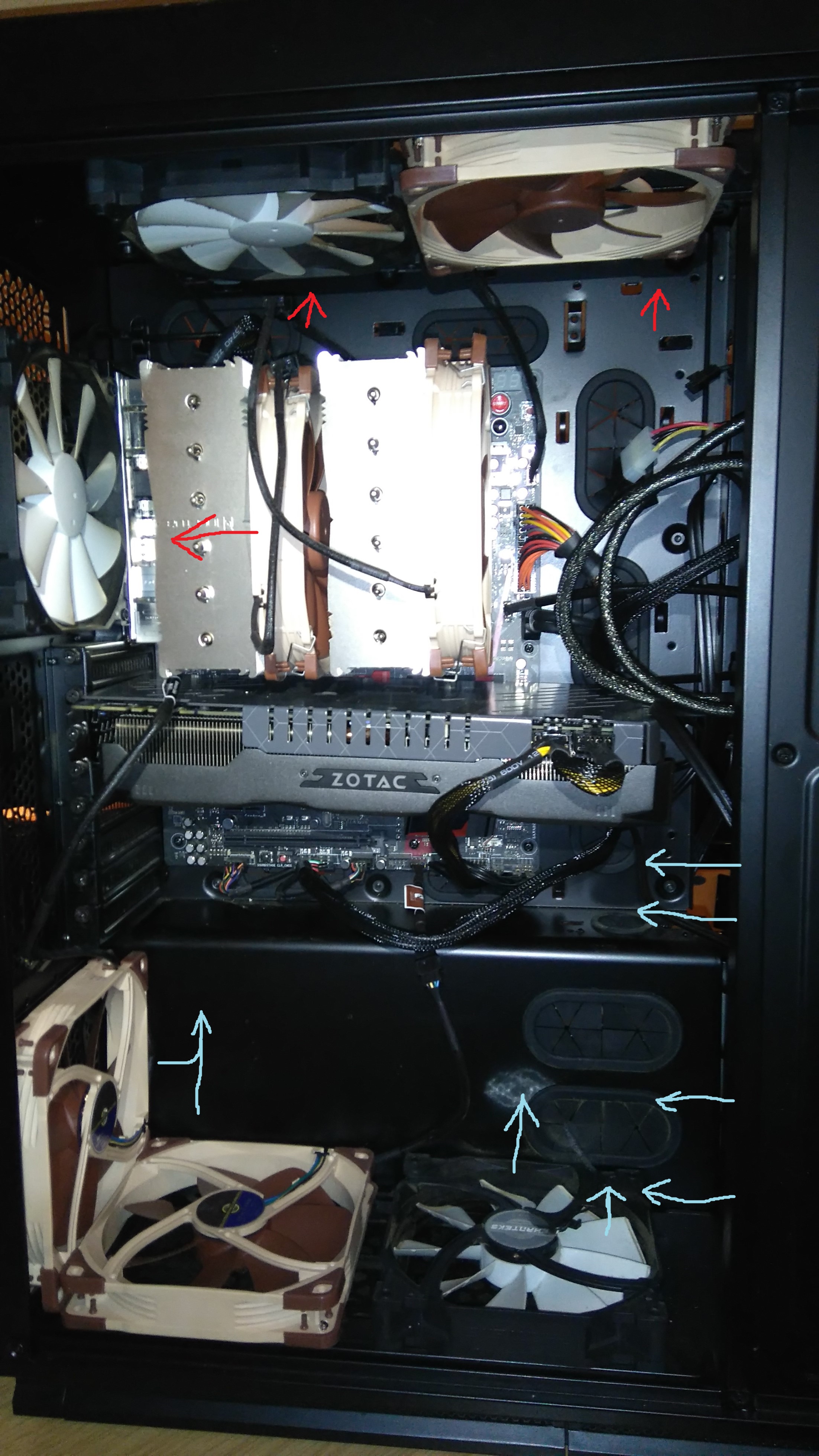 ich denke gekühlt wird mit 7 lüftern auch mehr als genug. auf dem 2. foto zu sehen, sind unten rechts die beiden 140mm lüfter welche luft reinsaugen (oberer hhd-käfig demontiert) wie die 3 anderen unten auch.